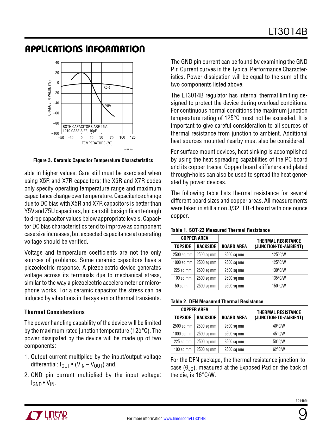LT3014B APPLICATIONS INFORMATION 40 The GND pin current can be found by examining the GND Pin Current curves in the Typical Performance Character- 20 istics. Power dissipation will be equal to the sum of the 0 two components listed above. X5R –20 The LT3014B regulator has internal thermal limiting de- –40 signed to protect the device during overload conditions. Y5V For continuous normal conditions the maximum junction –60 CHANGE IN VALUE (%) temperature rating of 125°C must not be exceeded. It is –80 BOTH CAPACITORS ARE 16V, important to give careful consideration to all sources of 1210 CASE SIZE, 10µF –100 thermal resistance from junction to ambient. Additional –50 –25 0 25 50 75 100 125 TEMPERATURE (°C) heat sources mounted nearby must also be considered. 3014B F03 For surface mount devices, heat sinking is accomplished Figure 3. Ceramic Capacitor Temperature Characteristics by using the heat spreading capabilities of the PC board and its copper traces. Copper board stiffeners and plated able in higher values. Care still must be exercised when through-holes can also be used to spread the heat gener- using X5R and X7R capacitors; the X5R and X7R codes ated by power devices. only specify operating temperature range and maximum capacitance change over temperature. Capacitance change The following table lists thermal resistance for several due to DC bias with X5R and X7R capacitors is better than different board sizes and copper areas. All measurements Y5V and Z5U capacitors, but can still be significant enough were taken in still air on 3/32” FR-4 board with one ounce to drop capacitor values below appropriate levels. Capaci- copper. tor DC bias characteristics tend to improve as component Table 1. SOT-23 Measured Thermal Resistance case size increases, but expected capacitance at operating COPPER AREA voltage should be verified. THERMAL RESISTANCETOPSIDE BACKSIDE BOARD AREA(JUNCTION-TO-AMBIENT) Voltage and temperature coefficients are not the only 2500 sq mm 2500 sq mm 2500 sq mm 125°C/W sources of problems. Some ceramic capacitors have a 1000 sq mm 2500 sq mm 2500 sq mm 125°C/W piezoelectric response. A piezoelectric device generates 225 sq mm 2500 sq mm 2500 sq mm 130°C/W voltage across its terminals due to mechanical stress, 100 sq mm 2500 sq mm 2500 sq mm 135°C/W similar to the way a piezoelectric accelerometer or micro- 50 sq mm 2500 sq mm 2500 sq mm 150°C/W phone works. For a ceramic capacitor the stress can be induced by vibrations in the system or thermal transients. Table 2. DFN Measured Thermal ResistanceThermal ConsiderationsCOPPER AREATHERMAL RESISTANCETOPSIDE BACKSIDE BOARD AREA(JUNCTION-TO-AMBIENT) The power handling capability of the device will be limited 2500 sq mm 2500 sq mm 2500 sq mm 40°C/W by the maximum rated junction temperature (125°C). The 1000 sq mm 2500 sq mm 2500 sq mm 45°C/W power dissipated by the device will be made up of two 225 sq mm 2500 sq mm 2500 sq mm 50°C/W components: 100 sq mm 2500 sq mm 2500 sq mm 62°C/W 1. Output current multiplied by the input/output voltage For the DFN package, the thermal resistance junction-to- differential: IOUT • (VIN – VOUT) and, case (θJC), measured at the Exposed Pad on the back of 2. GND pin current multiplied by the input voltage: the die, is 16°C/W. IGND • VIN. 3014bfb For more information www.linear.com/LT3014B 9 Document Outline Features Description Applications Typical Application Absolute Maximum Ratings Pin Configuration Electrical Characteristics Typical Performance Characteristics Pin Functions Applications Information
