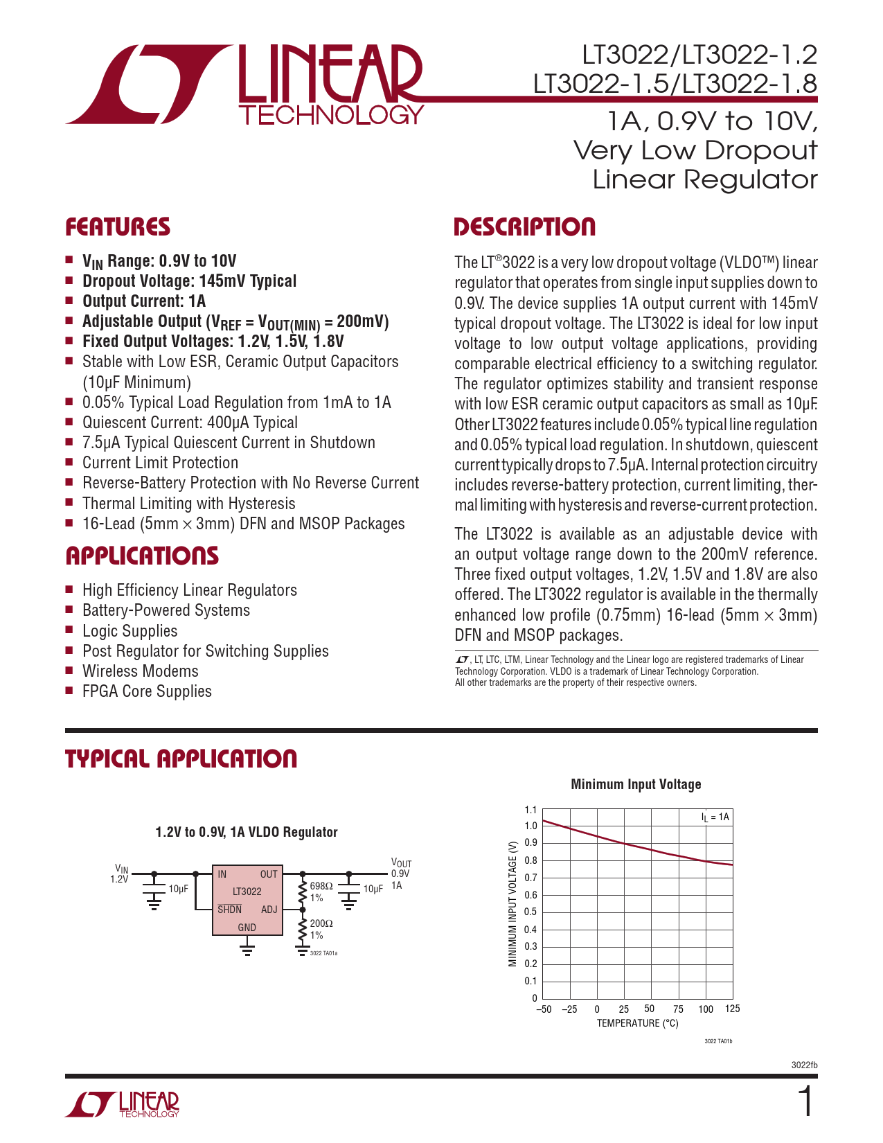 LT3022/LT3022-1.2 LT3022-1.5/LT3022-1.8 1A, 0.9V to 10V, Very Low Dropout Linear Regulator FEATURESDESCRIPTION n VIN Range: 0.9V to 10V The LT®3022 is a very low dropout voltage (VLDO™) linear n Dropout Voltage: 145mV Typical regulator that operates from single input supplies down to n Output Current: 1A 0.9V. The device supplies 1A output current with 145mV n Adjustable Output (VREF = VOUT(MIN) = 200mV) typical dropout voltage. The LT3022 is ideal for low input n Fixed Output Voltages: 1.2V, 1.5V, 1.8V voltage to low output voltage applications, providing n Stable with Low ESR, Ceramic Output Capacitors comparable electrical efficiency to a switching regulator. (10µF Minimum) The regulator optimizes stability and transient response n 0.05% Typical Load Regulation from 1mA to 1A with low ESR ceramic output capacitors as small as 10µF. n Quiescent Current: 400µA Typical Other LT3022 features include 0.05% typical line regulation n 7.5µA Typical Quiescent Current in Shutdown and 0.05% typical load regulation. In shutdown, quiescent n Current Limit Protection current typically drops to 7.5µA. Internal protection circuitry n Reverse-Battery Protection with No Reverse Current includes reverse-battery protection, current limiting, ther- n Thermal Limiting with Hysteresis mal limiting with hysteresis and reverse-current protection. n 16-Lead (5mm × 3mm) DFN and MSOP Packages The LT3022 is available as an adjustable device with an output voltage range down to the 200mV reference. APPLICATIONS Three fixed output voltages, 1.2V, 1.5V and 1.8V are also n High Efficiency Linear Regulators offered. The LT3022 regulator is available in the thermally n Battery-Powered Systems enhanced low profile (0.75mm) 16-lead (5mm × 3mm) n Logic Supplies DFN and MSOP packages. n Post Regulator for Switching Supplies L, LT, LTC, LTM, Linear Technology and the Linear logo are registered trademarks of Linear n Wireless Modems Technology Corporation. VLDO is a trademark of Linear Technology Corporation. All other trademarks are the property of their respective owners. n FPGA Core Supplies TYPICAL APPLICATIONMinimum Input Voltage 1.1 IL = 1A 1.2V to 0.9V, 1A VLDO Regulator 1.0 0.9 0.8 V VOUT IN IN 1.2V OUT 0.9V 0.7 10µF 698Ω 1A LT3022 10µF 1% 0.6 SHDN ADJ 0.5 200Ω GND 1% 0.4 0.3 3022 TA01a MINIMUM INPUT VOLTAGE (V) 0.2 0.1 0–50 –25 0 25 50 75 100 125 TEMPERATURE (°C) 3022 TA01b 3022fb 1 Document Outline Features Description Applications Typical Application Absolute Maximum Ratings Pin Configuration Order Information Electrical Characteristics Typical Performance Characteristics Pin Functions Block Diagram Applications Information Package Description Revision History Typical Application Related Parts