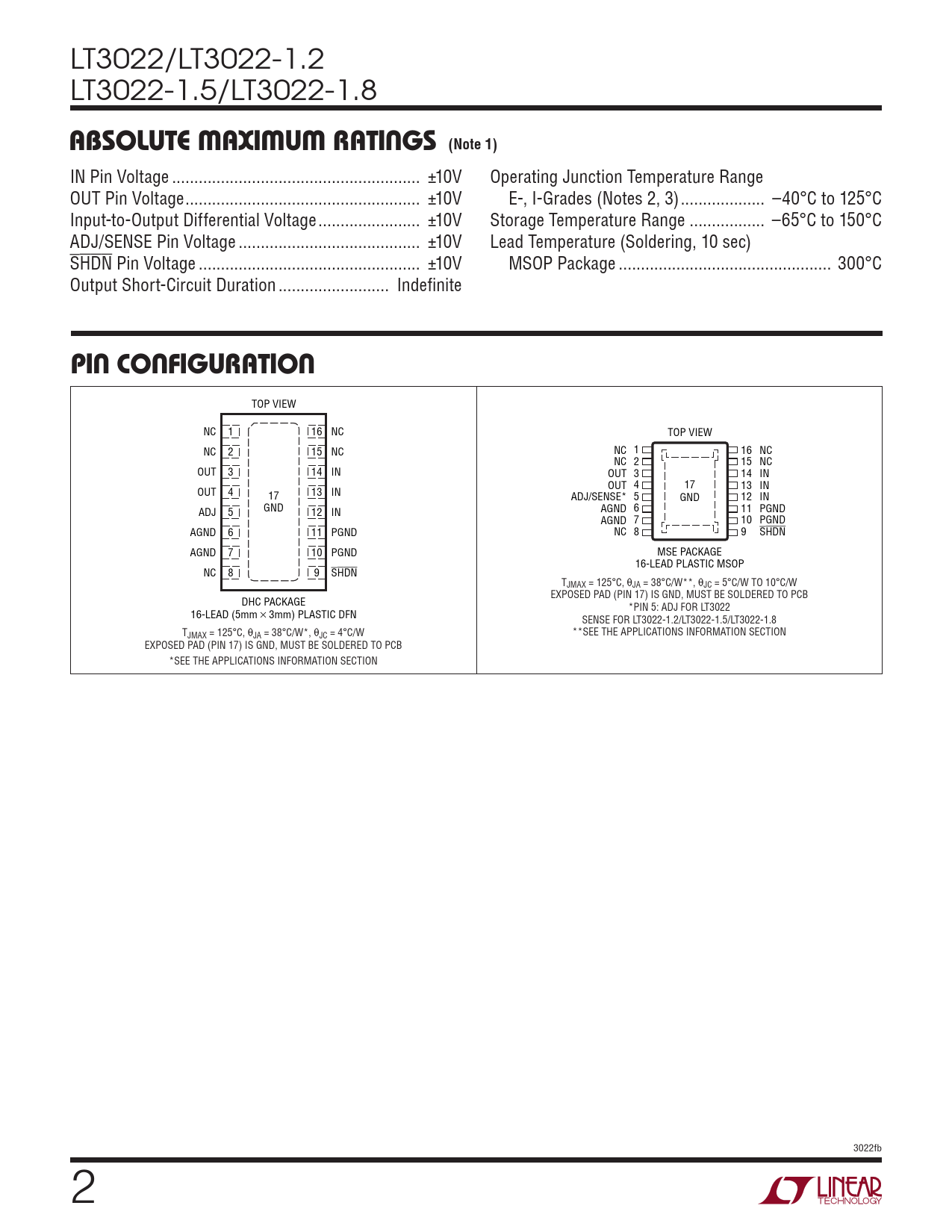 Datasheet LT3022, LT3022-1.2, LT3022-1.5, LT3022-1.8 (Analog Devices) - 2