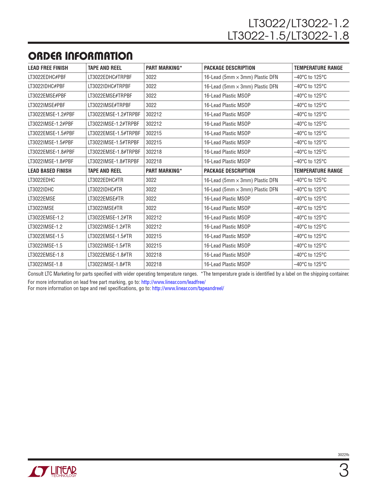 LT3022/LT3022-1.2 LT3022-1.5/LT3022-1.8 ORDER INFORMATION LEAD FREE FINISHTAPE AND REELPART MARKING*PACKAGE DESCRIPTIONTEMPERATURE RANGE LT3022EDHC#PBF LT3022EDHC#TRPBF 3022 16-Lead (5mm × 3mm) Plastic DFN –40°C to 125°C LT3022IDHC#PBF LT3022IDHC#TRPBF 3022 16-Lead (5mm × 3mm) Plastic DFN –40°C to 125°C LT3022EMSE#PBF LT3022EMSE#TRPBF 3022 16-Lead Plastic MSOP –40°C to 125°C LT3022IMSE#PBF LT3022IMSE#TRPBF 3022 16-Lead Plastic MSOP –40°C to 125°C LT3022EMSE-1.2#PBF LT3022EMSE-1.2#TRPBF 302212 16-Lead Plastic MSOP –40°C to 125°C LT3022IMSE-1.2#PBF LT3022IMSE-1.2#TRPBF 302212 16-Lead Plastic MSOP –40°C to 125°C LT3022EMSE-1.5#PBF LT3022EMSE-1.5#TRPBF 302215 16-Lead Plastic MSOP –40°C to 125°C LT3022IMSE-1.5#PBF LT3022IMSE-1.5#TRPBF 302215 16-Lead Plastic MSOP –40°C to 125°C LT3022EMSE-1.8#PBF LT3022EMSE-1.8#TRPBF 302218 16-Lead Plastic MSOP –40°C to 125°C LT3022IMSE-1.8#PBF LT3022IMSE-1.8#TRPBF 302218 16-Lead Plastic MSOP –40°C to 125°C LEAD BASED FINISHTAPE AND REELPART MARKING*PACKAGE DESCRIPTIONTEMPERATURE RANGE LT3022EDHC LT3022EDHC#TR 3022 16-Lead (5mm × 3mm) Plastic DFN –40°C to 125°C LT3022IDHC LT3022IDHC#TR 3022 16-Lead (5mm × 3mm) Plastic DFN –40°C to 125°C LT3022EMSE LT3022EMSE#TR 3022 16-Lead Plastic MSOP –40°C to 125°C LT3022IMSE LT3022IMSE#TR 3022 16-Lead Plastic MSOP –40°C to 125°C LT3022EMSE-1.2 LT3022EMSE-1.2#TR 302212 16-Lead Plastic MSOP –40°C to 125°C LT3022IMSE-1.2 LT3022IMSE-1.2#TR 302212 16-Lead Plastic MSOP –40°C to 125°C LT3022EMSE-1.5 LT3022EMSE-1.5#TR 302215 16-Lead Plastic MSOP –40°C to 125°C LT3022IMSE-1.5 LT3022IMSE-1.5#TR 302215 16-Lead Plastic MSOP –40°C to 125°C LT3022EMSE-1.8 LT3022EMSE-1.8#TR 302218 16-Lead Plastic MSOP –40°C to 125°C LT3022IMSE-1.8 LT3022IMSE-1.8#TR 302218 16-Lead Plastic MSOP –40°C to 125°C Consult LTC Marketing for parts specified with wider operating temperature ranges. *The temperature grade is identified by a label on the shipping container. For more information on lead free part marking, go to: http://www.linear.com/leadfree/ For more information on tape and reel specifications, go to: http://www.linear.com/tapeandreel/ 3022fb 3 Document Outline Features Description Applications Typical Application Absolute Maximum Ratings Pin Configuration Order Information Electrical Characteristics Typical Performance Characteristics Pin Functions Block Diagram Applications Information Package Description Revision History Typical Application Related Parts