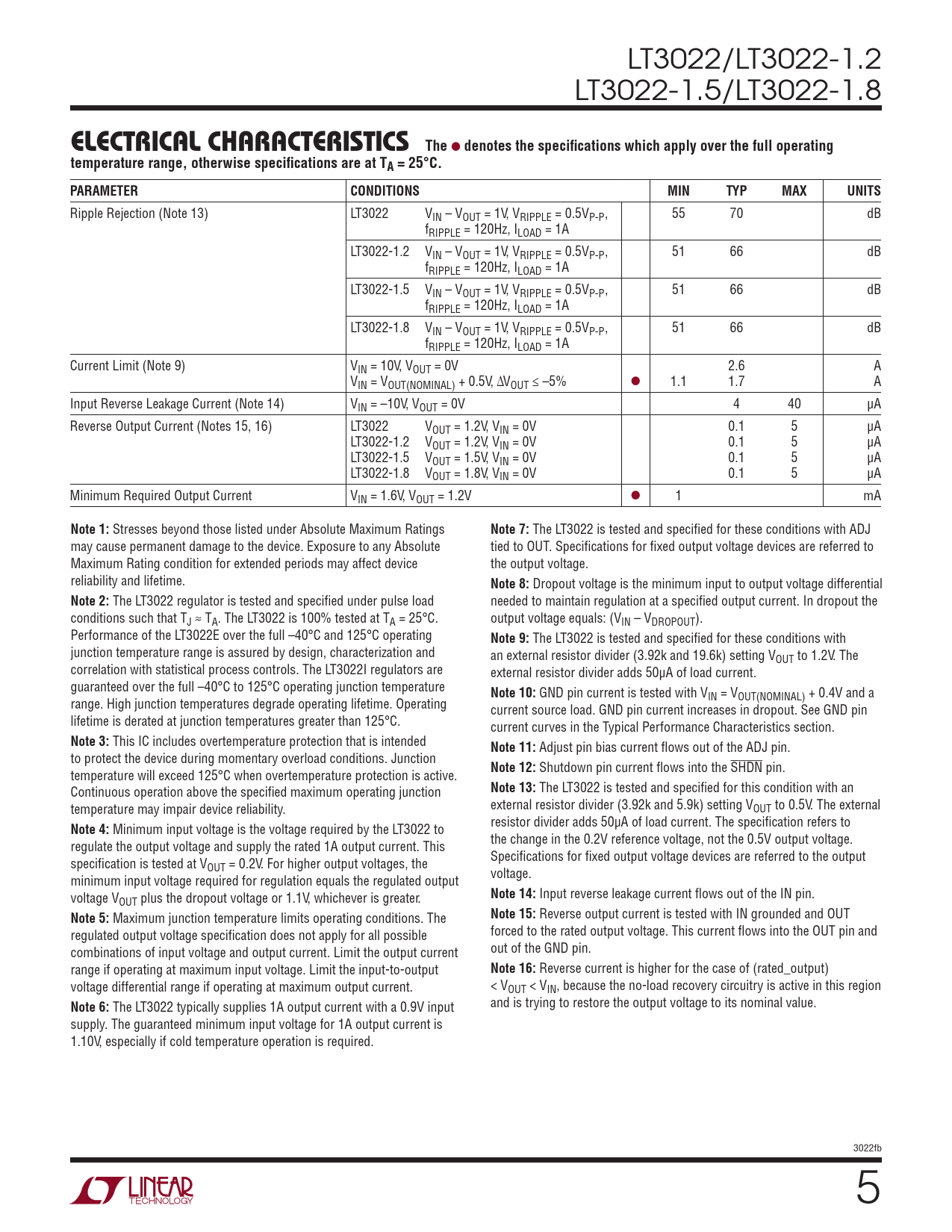 Ripple Rejection (Note 13) LT3022 VIN – VOUT = 1V, VRIPPLE = 0.5VP-P , 55 70 dB fRIPPLE = 120Hz, ILOAD = 1A LT3022-1.2 VIN – VOUT = 1V, VRIPPLE = 0.5VP-P , 51 66 dB fRIPPLE = 120Hz, ILOAD = 1A LT3022-1.5 VIN – VOUT = 1V, VRIPPLE = 0.5VP-P , 51 66 dB fRIPPLE = 120Hz, ILOAD = 1A LT3022-1.8 VIN – VOUT = 1V, VRIPPLE = 0.5VP-P , 51 66 dB fRIPPLE = 120Hz, ILOAD = 1A Current Limit (Note 9) VIN = 10V, VOUT = 0V 2.6 A VIN = VOUT(NOMINAL) + 0.5V, ∆VOUT ≤ –5% l 1.1 1.7 A Input Reverse Leakage Current (Note 14) VIN = –10V, VOUT = 0V 4 40 µA Reverse Output Current (Notes 15, 16) LT3022 VOUT = 1.2V, VIN = 0V 0.1 5 µA LT3022-1.2 VOUT = 1.2V, VIN = 0V 0.1 5 µA LT3022-1.5 VOUT = 1.5V, VIN = 0V 0.1 5 µA LT3022-1.8 VOUT = 1.8V, VIN = 0V 0.1 5 µA Minimum Required Output Current VIN = 1.6V, VOUT = 1.2V l 1 mA