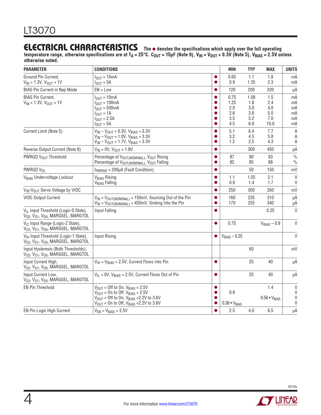 LT3070 ELECTRICALCHARACTERISTICS The l denotes the specifications which apply over the full operatingtemperature range, otherwise specifications are at TA = 25°C. COUT = 15µF (Note 9), VIN = VOUT + 0.3V (Note 5), VBIAS = 2.5V unlessotherwise noted.PARAMETERCONDITIONSMINTYPMAXUNITS Ground Pin Current, IOUT = 10mA l 0.65 1.1 1.8 mA VIN = 1.3V, VOUT = 1V IOUT = 5A l 0.9 1.35 2.3 mA BIAS Pin Current in Nap Mode EN = Low l 120 200 320 µA BIAS Pin Current, IOUT = 10mA l 0.75 1.08 1.5 mA VIN = 1.3V, VOUT = 1V IOUT = 100mA l 1.25 1.8 2.4 mA IOUT = 500mA l 2.0 3.0 4.0 mA IOUT = 1A l 2.6 3.8 5.0 mA IOUT = 2.5A l 3.5 5.2 7.0 mA IOUT = 5A l 4.5 6.9 10.0 mA Current Limit (Note 5) VIN – VOUT < 0.3V, VBIAS = 3.3V l 5.1 6.4 7.7 A VIN – VOUT = 1.0V, VBIAS = 3.3V l 3.2 4.5 5.8 A VIN – VOUT = 1.7V, VBIAS = 3.3V l 1.2 2.5 4.3 A Reverse Output Current (Note 8) VIN = 0V, VOUT = 1.8V l 300 450 µA PWRGD VOUT Threshold Percentage of VOUT(NOMINAL), VOUT Rising l 87 90 93 % Percentage of VOUT(NOMINAL), VOUT Falling l 82 85 88 % PWRGD VOL IPWRGD = 200µA (Fault Condition) l 50 150 mV VBIAS Undervoltage Lockout VBIAS Rising l 1.1 1.55 2.1 V VBIAS Falling l 0.9 1.4 1.7 V VIN-VOUT Servo Voltage by VIOC l 250 300 350 mV VIOC Output Current VIN = VOUT(NOMINAL) + 150mV, Sourcing Out of the Pin l 160 235 310 µA VIN = VOUT(NOMINAL) + 450mV, Sinking Into the Pin l 170 255 340 µA VIL Input Threshold (Logic-0 State), Input Falling l 0.25 V VO2, VO1, VO0, MARGSEL, MARGTOL VIZ Input Range (Logic-Z State), l 0.75 VBIAS – 0.9 V VO2, VO1, VO0, MARGSEL, MARGTOL VIH Input Threshold (Logic-1 State), Input Rising l VBIAS – 0.25 V VO2, VO1, VO0, MARGSEL, MARGTOL Input Hysteresis (Both Thresholds), 60 mV VO2, VO1, VO0, MARGSEL, MARGTOL Input Current High, VIH = VBIAS = 2.5V, Current Flows Into Pin l 25 40 µA VO2, VO1, VO0, MARGSEL, MARGTOL Input Current Low, VIL = 0V, VBIAS = 2.5V, Current Flows Out of Pin l 25 40 µA VO2, VO1, VO0, MARGSEL, MARGTOL EN Pin Threshold VOUT = Off to On, VBIAS = 2.5V l 1.4 V VOUT = On to Off, VBIAS = 2.5V l 0.9 V VOUT = Off to On, VBIAS =2.2V to 3.6V l 0.56 • VBIAS V VOUT = On to Off, VBIAS =2.2V to 3.6V l 0.36 • VBIAS V EN Pin Logic High Current VEN = VBIAS = 2.5V l 2.5 4.0 6.5 µA 3070fc 4 For more information www.linear.com/LT3070 Document Outline Features Applications Description Typical Application Absolute Maximum Ratings Pin Configuration Order Information Electrical Characteristics Typical Performance Characteristics Pin Functions Block Diagram Applications Information Package Description Revision History Typical Application Related Parts