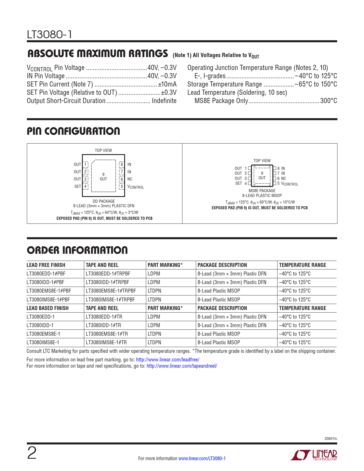 LT3080EDD-1#PBF LT3080EDD-1#TRPBF LDPM 8-Lead (3mm × 3mm) Plastic DFN –40°C to 125°C LT3080IDD-1#PBF LT3080IDD-1#TRPBF LDPM 8-Lead (3mm × 3mm) Plastic DFN –40°C to 125°C LT3080EMS8E-1#PBF LT3080EMS8E-1#TRPBF LTDPN 8-Lead Plastic MSOP –40°C to 125°C LT3080IMS8E-1#PBF LT3080IMS8E-1#TRPBF LTDPN 8-Lead Plastic MSOP –40°C to 125°C