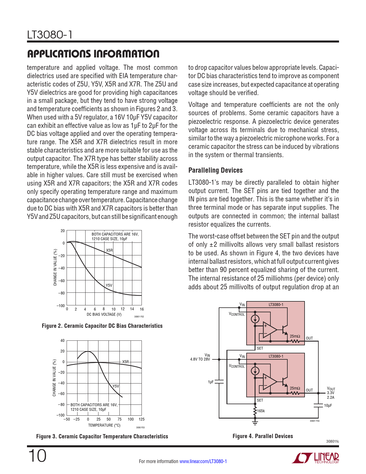 LT3080-1 applicaTions inFormaTion temperature and applied voltage. The most common to drop capacitor values below appropriate levels. Capaci- dielectrics used are specified with EIA temperature char- tor DC bias characteristics tend to improve as component acteristic codes of Z5U, Y5V, X5R and X7R. The Z5U and case size increases, but expected capacitance at operating Y5V dielectrics are good for providing high capacitances voltage should be verified. in a small package, but they tend to have strong voltage and temperature coefficients as shown in Figures 2 and 3. Voltage and temperature coefficients are not the only When used with a 5V regulator, a 16V 10µF Y5V capacitor sources of problems. Some ceramic capacitors have a can exhibit an effective value as low as 1µF to 2µF for the piezoelectric response. A piezoelectric device generates DC bias voltage applied and over the operating tempera- voltage across its terminals due to mechanical stress, ture range. The X5R and X7R dielectrics result in more similar to the way a piezoelectric microphone works. For a stable characteristics and are more suitable for use as the ceramic capacitor the stress can be induced by vibrations output capacitor. The X7R type has better stability across in the system or thermal transients. temperature, while the X5R is less expensive and is avail- Paralleling Devices able in higher values. Care still must be exercised when using X5R and X7R capacitors; the X5R and X7R codes LT3080-1’s may be directly paralleled to obtain higher only specify operating temperature range and maximum output current. The SET pins are tied together and the capacitance change over temperature. Capacitance change IN pins are tied together. This is the same whether it’s in due to DC bias with X5R and X7R capacitors is better than three terminal mode or has separate input supplies. The Y5V and Z5U capacitors, but can still be significant enough outputs are connected in common; the internal ballast resistor equalizes the currents. 20 BOTH CAPACITORS ARE 16V, 1210 CASE SIZE, 10µF The worst-case offset between the SET pin and the output 0 of only ±2 millivolts allows very small ballast resistors X5R to be used. As shown in Figure 4, the two devices have –20 ALUE (%) internal ballast resistors, which at full output current gives –40 better than 90 percent equalized sharing of the current. –60 The internal resistance of 25 milliohms (per device) only CHANGE IN V Y5V adds about 25 millivolts of output regulation drop at an –80 –100 VIN LT3080-1 0 2 4 6 8 10 12 14 16 DC BIAS VOLTAGE (V) VCONTROL 30801 F02 Figure 2. Ceramic Capacitor DC Bias Characteristics + – 25mΩ 40 OUT SET 20 VIN VIN LT3080-1 4.8V TO 28V 0 X5R VCONTROL –20 + –40 1µF Y5V – 25mΩ VOUT OUT –60 CHANGE IN VALUE (%) 3.3V 2.2A SET –80 BOTH CAPACITORS ARE 16V, 10µF 1210 CASE SIZE, 10µF 165k –100–50 –25 0 25 50 75 100 125 30801 F04 TEMPERATURE (°C) 3080 F03 Figure 3. Ceramic Capacitor Temperature CharacteristicsFigure 4. Parallel Devices 30801fc 10 For more information www.linear.com/LT3080-1 Document Outline Features Applications Typical Application Description Absolute Maximum Ratings Pin Configuration Order Information Electrical Characteristics Typical Performance Characteristics Pin Functions Block Diagram Applications Information Typical Applications Package Description Revision History Typical Application Related Parts