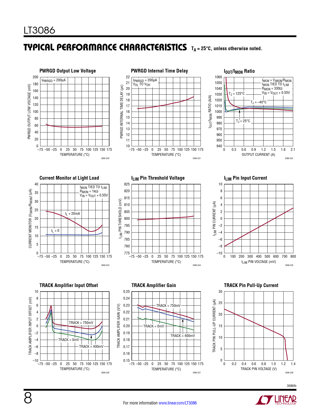 200 22 1060 IPWRGD = 200µA IPWRGD = 200µA I 21 1050 MON = VIMON/RMON 180 VOL TO VOH IMON TIED TO ILIM 20 1040 RMON = 330Ω 160 Y (µs) 19 1030 V T IN = VOUT + 0.55V J = 125°C TAGE (mV) 140 18 1020 TJ = –40°C 120 17 TIO (A/A) 1010 100 16 RA 1000 15 990 80 /I MON 14 980 TJ = 25°C 60 I OUT 13 970 40 12 960 PWRGD OUTPUT LOW VOL 20 PWRGD INTERNAL TIME DELA 11 950 0 10 940 –75 –50 –25 0 25 50 75 100 125 150 175 –75 –50 –25 0 25 50 75 100 125 150 175 0 0.3 0.6 0.9 1.2 1.5 1.8 2.1 TEMPERATURE (°C) TEMPERATURE (°C) OUTPUT CURRENT (A) 3086 G20 3086 G21 3086 G22
