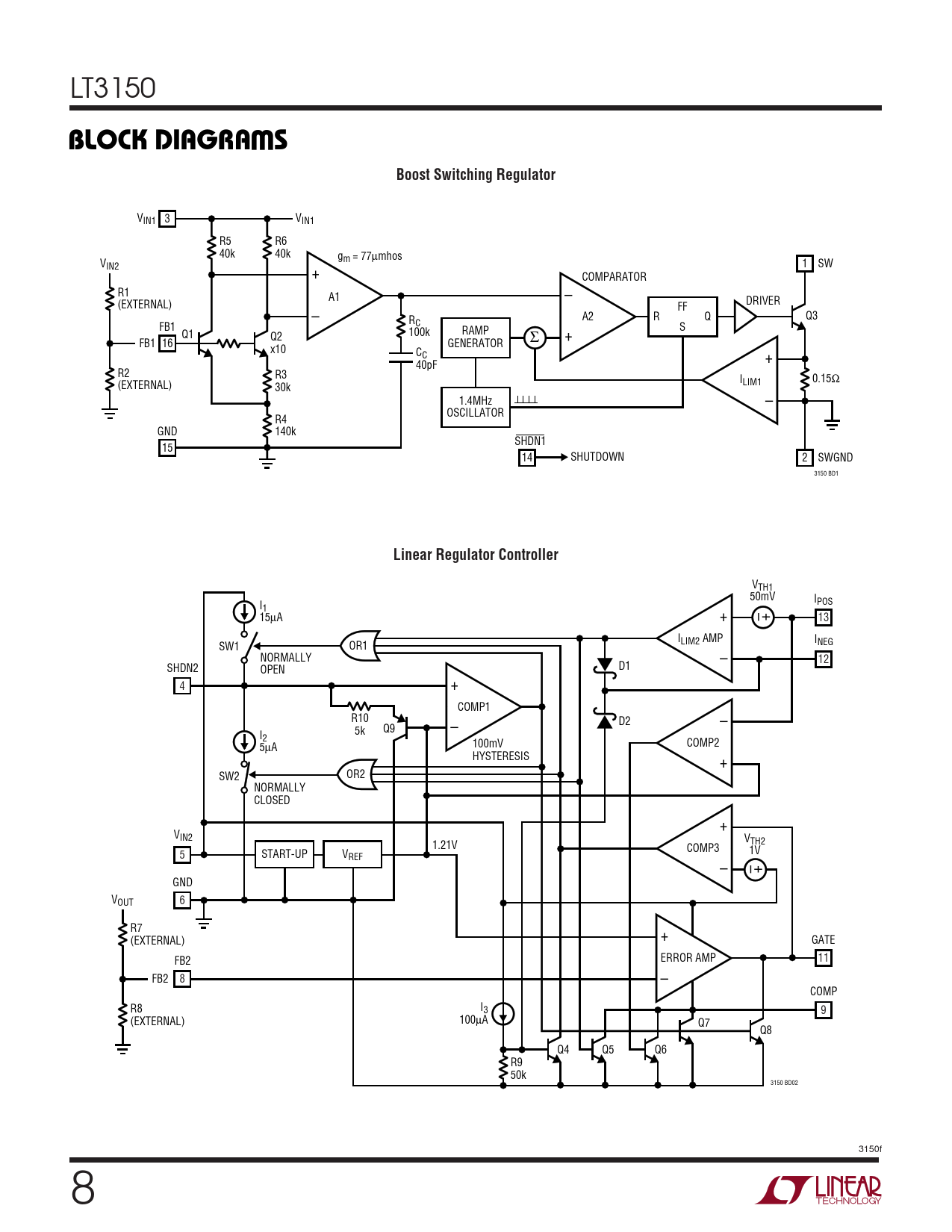 VTH1 50mV I I POS 1 – + 15µA + 13 ILIM2 AMP I SW1 NEG OR1 NORMALLY – 12 SHDN2 OPEN D1 4 + COMP1 R10 D2 – Q9 5k – I2 5µA 100mV COMP2 HYSTERESIS + SW2 OR2 NORMALLY CLOSED + VIN2 VTH2 1.21V COMP3 1V 5 START-UP VREF – – + GND VOUT 6 R7 + (EXTERNAL) GATE ERROR AMP FB2 11 FB2 8 – COMP R8 I3 9 (EXTERNAL) 100µA Q7 Q8 Q4 Q5 Q6 R9 50k 3150 BD02 3150f 8