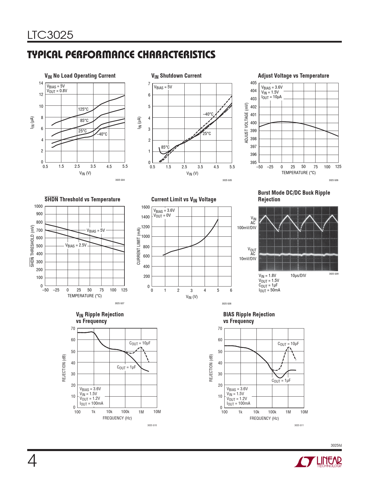 14 7 405 VBIAS = 5V VBIAS = 5V VBIAS = 3.6V VOUT = 0.8V 404 V 12 6 IN = 1.5V I 403 OUT = 10μA 10 5 402 125°C –40°C 401 8 4 85°C (μA) (μA) 400 I IN 6 I IN 25°C 3 399 –40°C 25°C 4 2 398 ADJUST VOLTAGE (mV) 85°C 397 2 1 396 0 0 395 0.5 1.5 2.5 3.5 4.5 5.5 0.5 1.5 2.5 3.5 4.5 5.5 –50 –25 0 25 50 75 100 125 VIN (V) VIN (V) TEMPERATURE (°C) 3025 G04 3025 G05 3025 G06