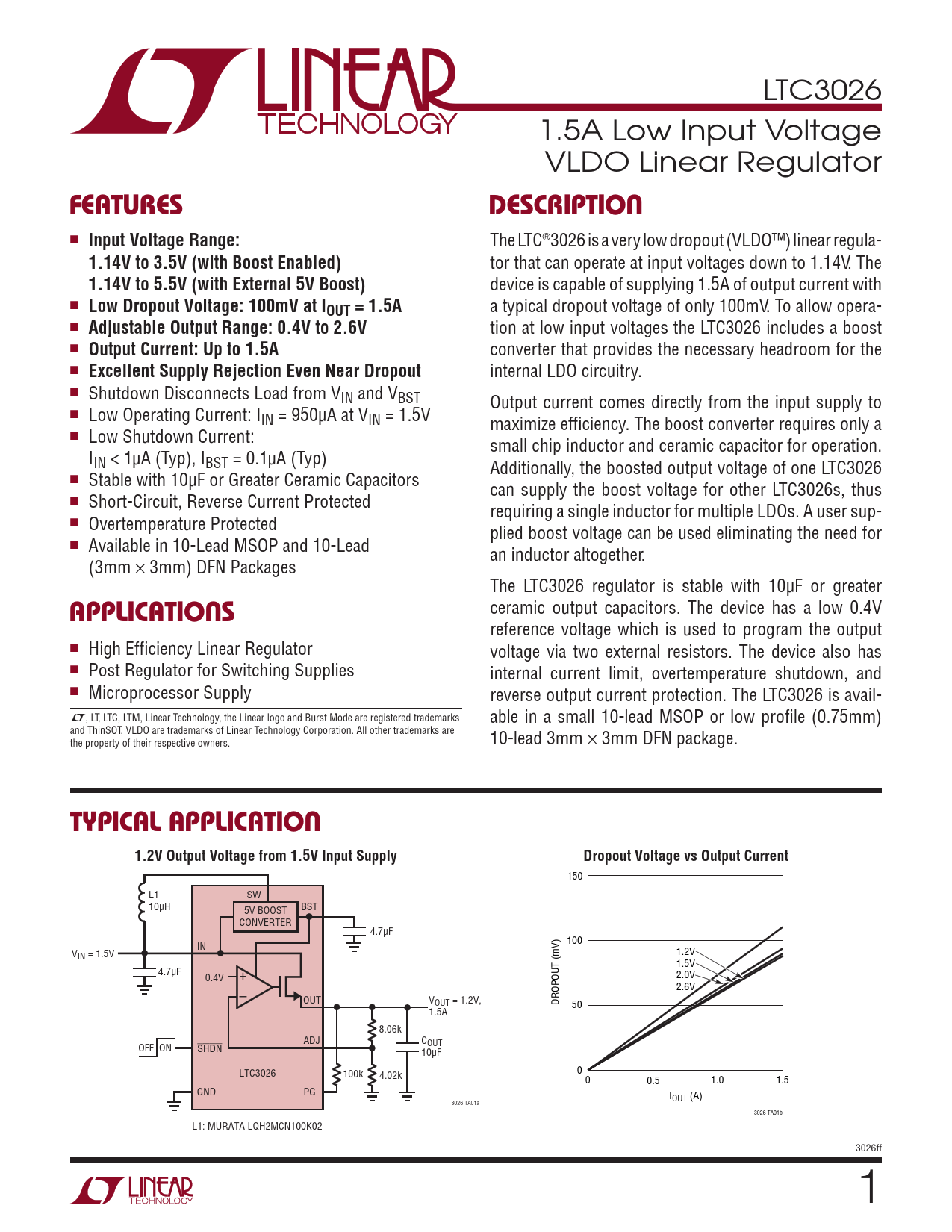 LTC3026 1.5A Low Input Voltage VLDO Linear Regulator FeaTuresDescripTion n Input Voltage Range: The LTC®3026 is a very low dropout (VLDO™) linear regula- 1.14V to 3.5V (with Boost Enabled) tor that can operate at input voltages down to 1.14V. The 1.14V to 5.5V (with External 5V Boost) device is capable of supplying 1.5A of output current with n Low Dropout Voltage: 100mV at IOUT = 1.5A a typical dropout voltage of only 100mV. To allow opera- n Adjustable Output Range: 0.4V to 2.6V tion at low input voltages the LTC3026 includes a boost n Output Current: Up to 1.5A converter that provides the necessary headroom for the n Excellent Supply Rejection Even Near Dropout internal LDO circuitry. n Shutdown Disconnects Load from VIN and VBST Output current comes directly from the input supply to n Low Operating Current: IIN = 950µA at VIN = 1.5V maximize efficiency. The boost converter requires only a n Low Shutdown Current: small chip inductor and ceramic capacitor for operation. IIN < 1µA (Typ), IBST = 0.1µA (Typ) Additionally, the boosted output voltage of one LTC3026 n Stable with 10µF or Greater Ceramic Capacitors can supply the boost voltage for other LTC3026s, thus n Short-Circuit, Reverse Current Protected requiring a single inductor for multiple LDOs. A user sup- n Overtemperature Protected plied boost voltage can be used eliminating the need for n Available in 10-Lead MSOP and 10-Lead an inductor altogether. (3mm × 3mm) DFN Packages The LTC3026 regulator is stable with 10µF or greater applicaTions ceramic output capacitors. The device has a low 0.4V reference voltage which is used to program the output n High Efficiency Linear Regulator voltage via two external resistors. The device also has n Post Regulator for Switching Supplies internal current limit, overtemperature shutdown, and n Microprocessor Supply reverse output current protection. The LTC3026 is avail- L, LT, LTC, LTM, Linear Technology, the Linear logo and Burst Mode are registered trademarks able in a small 10-lead MSOP or low profile (0.75mm) and ThinSOT, VLDO are trademarks of Linear Technology Corporation. All other trademarks are the property of their respective owners. 10-lead 3mm × 3mm DFN package. Typical applicaTion1.2V Output Voltage from 1.5V Input SupplyDropout Voltage vs Output Current 150 L1 SW 10µH BST 5V BOOST CONVERTER 4.7µF 100 IN VIN = 1.5V 1.2V 1.5V 4.7µF 0.4V + 2.0V 2.6V – OUT VOUT = 1.2V, DROPOUT (mV) 50 1.5A 8.06k ADJ COUT OFF ON SHDN 10µF LTC3026 100k 4.02k 0 0 0.5 1.0 1.5 GND PG IOUT (A) 3026 TA01a 3026 TA01b L1: MURATA LQH2MCN100K02 3026ff 1 Document Outline Features Applications Description Typical Application Absolute Maximum Ratings Pin Configuration Order Information Electrical Characteristics Typical Performance Characteristics Pin Functions Block Diagram Operation Typical Applications Package Description Revision History Typical Application Related Parts