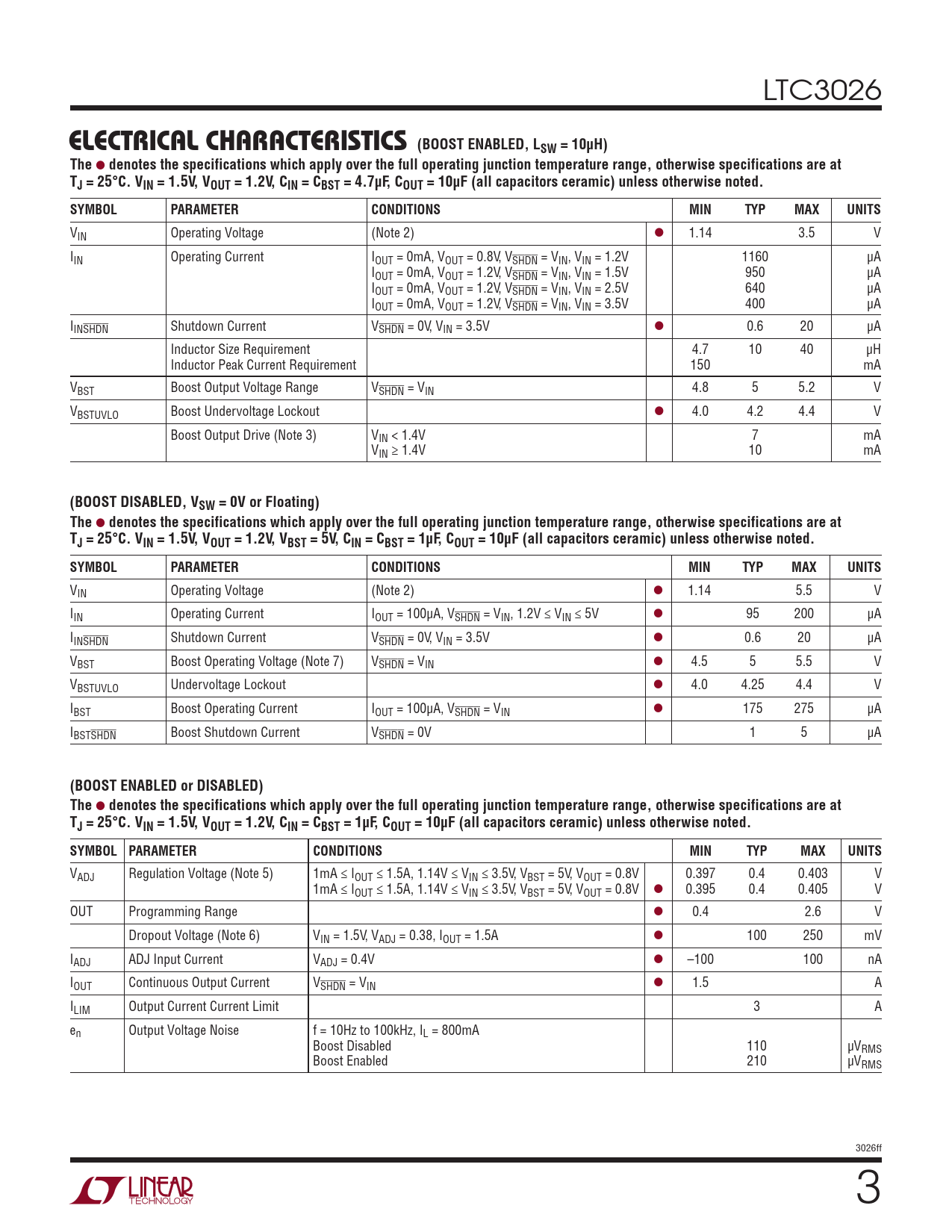 VADJ Regulation Voltage (Note 5) 1mA ≤ IOUT ≤ 1.5A, 1.14V ≤ VIN ≤ 3.5V, VBST = 5V, VOUT = 0.8V 0.397 0.4 0.403 V 1mA ≤ IOUT ≤ 1.5A, 1.14V ≤ VIN ≤ 3.5V, VBST = 5V, VOUT = 0.8V l 0.395 0.4 0.405 V OUT Programming Range l 0.4 2.6 V Dropout Voltage (Note 6) VIN = 1.5V, VADJ = 0.38, IOUT = 1.5A l 100 250 mV IADJ ADJ Input Current VADJ = 0.4V l –100 100 nA IOUT Continuous Output Current VSHDN = VIN l 1.5 A ILIM Output Current Current Limit 3 A en Output Voltage Noise f = 10Hz to 100kHz, IL = 800mA Boost Disabled 110 µVRMS Boost Enabled 210 µVRMS 3026ff 3 Document Outline Features Applications Description Typical Application Absolute Maximum Ratings Pin Configuration Order Information Electrical Characteristics Typical Performance Characteristics Pin Functions Block Diagram Operation Typical Applications Package Description Revision History Typical Application Related Parts
