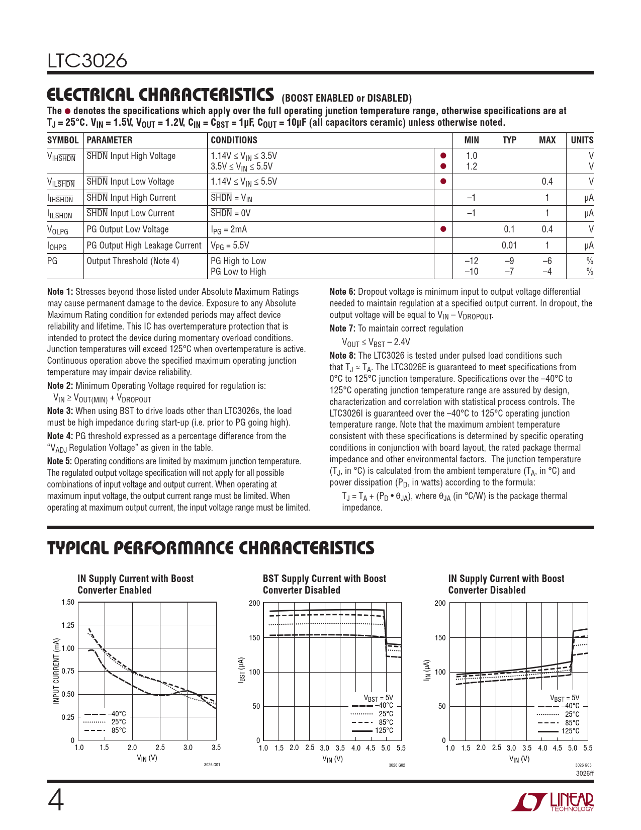 LTC3026 elecTrical characTerisTics (BOOST ENABLED or DISABLED)The l denotes the specifications which apply over the full operating junction temperature range, otherwise specifications are atTJ = 25°C. VIN = 1.5V, VOUT = 1.2V, CIN = CBST = 1µF, COUT = 10µF (all capacitors ceramic) unless otherwise noted. SYMBOL PARAMETERCONDITIONSMINTYPMAXUNITS VIHSHDN SHDN Input High Voltage 1.14V ≤ VIN ≤ 3.5V l 1.0 V 3.5V ≤ VIN ≤ 5.5V l 1.2 V VILSHDN SHDN Input Low Voltage 1.14V ≤ VIN ≤ 5.5V l 0.4 V IIHSHDN SHDN Input High Current SHDN = VIN –1 1 µA IILSHDN SHDN Input Low Current SHDN = 0V –1 1 µA VOLPG PG Output Low Voltage IPG = 2mA l 0.1 0.4 V IOHPG PG Output High Leakage Current VPG = 5.5V 0.01 1 µA PG Output Threshold (Note 4) PG High to Low –12 –9 –6 % PG Low to High –10 –7 –4 % Note 1: Stresses beyond those listed under Absolute Maximum Ratings Note 6: Dropout voltage is minimum input to output voltage differential may cause permanent damage to the device. Exposure to any Absolute needed to maintain regulation at a specified output current. In dropout, the Maximum Rating condition for extended periods may affect device output voltage will be equal to VIN – VDROPOUT. reliability and lifetime. This IC has overtemperature protection that is Note 7: To maintain correct regulation intended to protect the device during momentary overload conditions. V Junction temperatures will exceed 125°C when overtemperature is active. OUT ≤ VBST – 2.4V Continuous operation above the specified maximum operating junction Note 8: The LTC3026 is tested under pulsed load conditions such temperature may impair device reliability. that TJ ≈ TA. The LTC3026E is guaranteed to meet specifications from 0°C to 125°C junction temperature. Specifications over the –40°C to Note 2: Minimum Operating Voltage required for regulation is: 125°C operating junction temperature range are assured by design, VIN ≥ VOUT(MIN) + VDROPOUT characterization and correlation with statistical process controls. The Note 3: When using BST to drive loads other than LTC3026s, the load LTC3026I is guaranteed over the –40°C to 125°C operating junction must be high impedance during start-up (i.e. prior to PG going high). temperature range. Note that the maximum ambient temperature Note 4: PG threshold expressed as a percentage difference from the consistent with these specifications is determined by specific operating “VADJ Regulation Voltage” as given in the table. conditions in conjunction with board layout, the rated package thermal Note 5: Operating conditions are limited by maximum junction temperature. impedance and other environmental factors. The junction temperature The regulated output voltage specification will not apply for all possible (TJ, in °C) is calculated from the ambient temperature (TA, in °C) and combinations of input voltage and output current. When operating at power dissipation (PD, in watts) according to the formula: maximum input voltage, the output current range must be limited. When TJ = TA + (PD • θJA), where θJA (in °C/W) is the package thermal operating at maximum output current, the input voltage range must be limited. impedance. Typical perForMance characTerisTicsIN Supply Current with BoostBST Supply Current with BoostIN Supply Current with BoostConverter EnabledConverter DisabledConverter Disabled 1.50 200 200 1.25 150 150 1.00 0.75 (µA) 100 (µA) 100 I BST I IN 0.50 INPUT CURRENT (mA) VBST = 5V VBST = 5V 50 –40°C 50 –40°C 0.25 –40°C 25°C 25°C 25°C 85°C 85°C 85°C 125°C 125°C 0 0 0 1.0 1.5 2.0 2.5 3.0 3.5 1.0 1.5 2.0 2.5 3.0 3.5 4.0 4.5 5.0 5.5 1.0 1.5 2.0 2.5 3.0 3.5 4.0 4.5 5.0 5.5 VIN (V) VIN (V) VIN (V) 3026 G01 3026 G02 3026 G03 3026ff 4 Document Outline Features Applications Description Typical Application Absolute Maximum Ratings Pin Configuration Order Information Electrical Characteristics Typical Performance Characteristics Pin Functions Block Diagram Operation Typical Applications Package Description Revision History Typical Application Related Parts