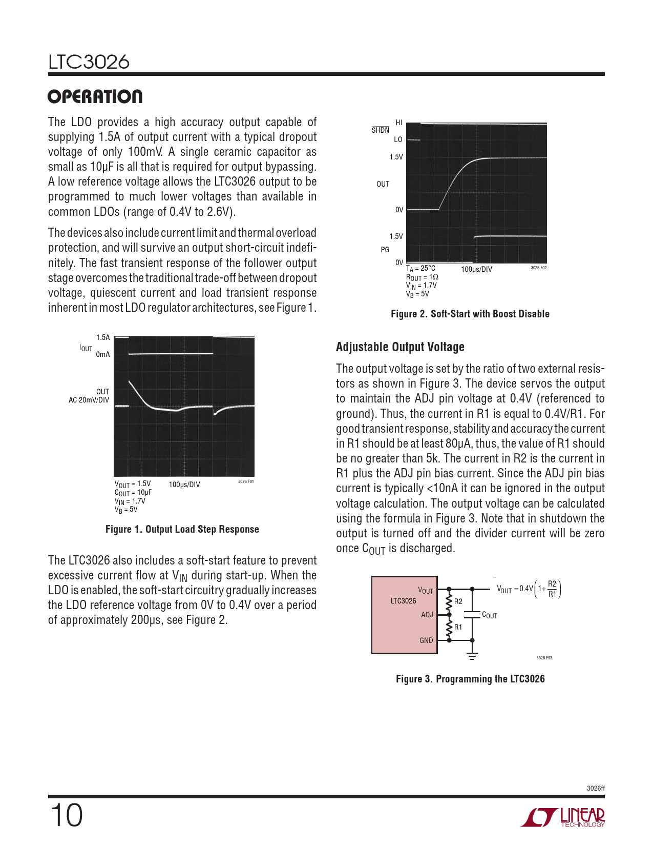 0mA The output voltage is set by the ratio of two external resis- tors as shown in Figure 3. The device servos the output OUT AC 20mV/DIV to maintain the ADJ pin voltage at 0.4V (referenced to ground). Thus, the current in R1 is equal to 0.4V/R1. For good transient response, stability and accuracy the current in R1 should be at least 80µA, thus, the value of R1 should be no greater than 5k. The current in R2 is the current in R1 plus the ADJ pin bias current. Since the ADJ pin bias V 3026 F01 OUT = 1.5V 100µs/DIV C current is typically <10nA it can be ignored in the output OUT = 10µF VIN = 1.7V voltage calculation. The output voltage can be calculated VB = 5V using the formula in Figure 3. Note that in shutdown the