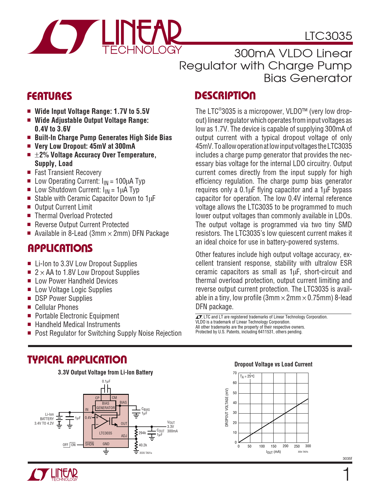 70 TA = 25°C 0.1µF 60 50 CP CM BIAS BIAS 40 GENERATOR IN CBIAS 1µF 30 Li-Ion 1µF 0.4V + BATTERY VOUT 20 3.4V TO 4.2V OUT – DROPOUT VOLTAGE (mV) 3.3V COUT 300mA LTC3035 294k 10 1µF ADJ 0 OFF ON SHDN GND 40.2k 0 50 100 150 200 250 300 I 3035 TA01a OUT (mA) 3035 TA01b 3035f 1