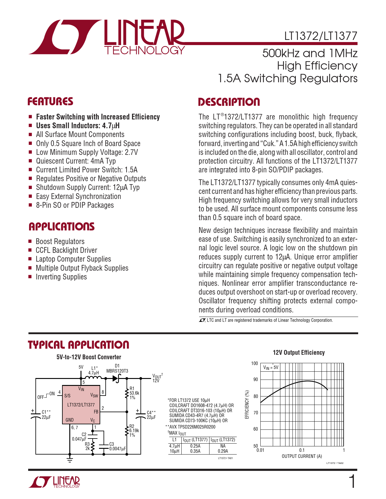 LT1372/LT1377 500kHz and 1MHz High Efficiency 1.5A Switching Regulators UFEATURESDESCRIPTIO ■ Faster Switching with Increased Efficiency The LT®1372/LT1377 are monolithic high frequency ■ Uses Small Inductors: 4.7 µ H switching regulators. They can be operated in all standard ■ All Surface Mount Components switching configurations including boost, buck, flyback, ■ Only 0.5 Square Inch of Board Space forward, inverting and “Cuk.” A 1.5A high efficiency switch ■ Low Minimum Supply Voltage: 2.7V is included on the die, along with all oscillator, control and ■ Quiescent Current: 4mA Typ protection circuitry. All functions of the LT1372/LT1377 ■ Current Limited Power Switch: 1.5A are integrated into 8-pin SO/PDIP packages. ■ Regulates Positive or Negative Outputs The LT1372/LT1377 typically consumes only 4mA quies- ■ Shutdown Supply Current: 12µA Typ cent current and has higher efficiency than previous parts. ■ Easy External Synchronization High frequency switching allows for very small inductors ■ 8-Pin SO or PDIP Packages to be used. All surface mount components consume less than 0.5 square inch of board space. UAPPLICATIO S New design techniques increase flexibility and maintain ■ Boost Regulators ease of use. Switching is easily synchronized to an exter- ■ CCFL Backlight Driver nal logic level source. A logic low on the shutdown pin ■ Laptop Computer Supplies reduces supply current to 12µA. Unique error amplifier ■ Multiple Output Flyback Supplies circuitry can regulate positive or negative output voltage ■ Inverting Supplies while maintaining simple frequency compensation tech- niques. Nonlinear error amplifier transconductance re- duces output overshoot on start-up or overload recovery. Oscillator frequency shifting protects external compo- nents during overload conditions. , LTC and LT are registered trademarks of Linear Technology Corporation. UTYPICAL APPLICATIO12V Output Efficiency5V-to-12V Boost Converter 100 5V D1 V L1* IN = 5V 4.7µH MBRS120T3 V † OUT 90 5 12V VIN R1 4 8 ON V 53.6k S/S SW OFF 80 1% *FOR LT1372 USE 10µH LT1372/LT1377 COILCRAFT DO1608-472 (4.7µH) OR 2 + + C1** FB COILCRAFT DT3316-103 (10µH) OR C4** 70 22µF 22µF SUMIDA CD43-4R7 (4.7µH) OR EFFICIENCY (%) GND VC SUMIDA CD73-100KC (10µH) OR 6, 7 1 R2 **AVX TPSD226M025R0200 60 6.19k C2 †MAX I 1% OUT 0.047µF L1 IOUT (LT1377) IOUT (LT1372) R3 C3 4.7µH 0.25A NA 50 2k 0.0047µF 10 0.35A 0.29A 0.01 0.1 1 µH OUTPUT CURRENT (A) LT1372 • TA01 LT1372 • TA02 1