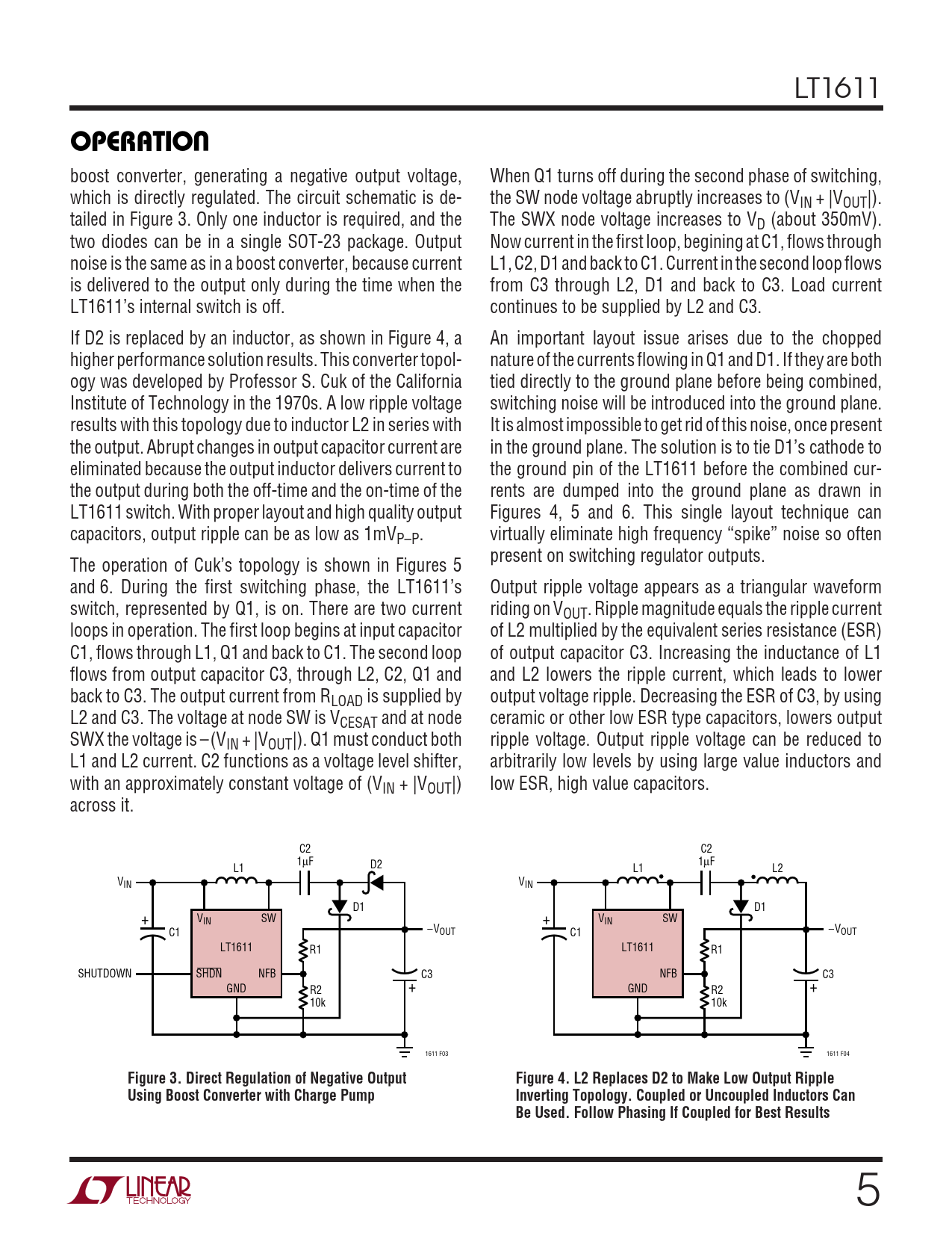 LT1611 UOPERATIO boost converter, generating a negative output voltage, When Q1 turns off during the second phase of switching, which is directly regulated. The circuit schematic is de- the SW node voltage abruptly increases to (VIN + |VOUT|). tailed in Figure 3. Only one inductor is required, and the The SWX node voltage increases to VD (about 350mV). two diodes can be in a single SOT-23 package. Output Now current in the first loop, begining at C1, flows through noise is the same as in a boost converter, because current L1, C2, D1 and back to C1. Current in the second loop flows is delivered to the output only during the time when the from C3 through L2, D1 and back to C3. Load current LT1611’s internal switch is off. continues to be supplied by L2 and C3. If D2 is replaced by an inductor, as shown in Figure 4, a An important layout issue arises due to the chopped higher performance solution results. This converter topol- nature of the currents flowing in Q1 and D1. If they are both ogy was developed by Professor S. Cuk of the California tied directly to the ground plane before being combined, Institute of Technology in the 1970s. A low ripple voltage switching noise will be introduced into the ground plane. results with this topology due to inductor L2 in series with It is almost impossible to get rid of this noise, once present the output. Abrupt changes in output capacitor current are in the ground plane. The solution is to tie D1’s cathode to eliminated because the output inductor delivers current to the ground pin of the LT1611 before the combined cur- the output during both the off-time and the on-time of the rents are dumped into the ground plane as drawn in LT1611 switch. With proper layout and high quality output Figures 4, 5 and 6. This single layout technique can capacitors, output ripple can be as low as 1mVP–P. virtually eliminate high frequency “spike” noise so often present on switching regulator outputs. The operation of Cuk’s topology is shown in Figures 5 and␣ 6. During the first switching phase, the LT1611’s Output ripple voltage appears as a triangular waveform switch, represented by Q1, is on. There are two current riding on VOUT. Ripple magnitude equals the ripple current loops in operation. The first loop begins at input capacitor of L2 multiplied by the equivalent series resistance (ESR) C1, flows through L1, Q1 and back to C1. The second loop of output capacitor C3. Increasing the inductance of L1 flows from output capacitor C3, through L2, C2, Q1 and and L2 lowers the ripple current, which leads to lower back to C3. The output current from RLOAD is supplied by output voltage ripple. Decreasing the ESR of C3, by using L2 and C3. The voltage at node SW is VCESAT and at node ceramic or other low ESR type capacitors, lowers output SWX the voltage is –(VIN + |VOUT|). Q1 must conduct both ripple voltage. Output ripple voltage can be reduced to L1 and L2 current. C2 functions as a voltage level shifter, arbitrarily low levels by using large value inductors and with an approximately constant voltage of (VIN + |VOUT|) low ESR, high value capacitors. across it. C2 C2 1µF 1µF L1 D2 L1 L2 VIN VIN D1 D1 V + IN SW V + IN SW –VOUT C1 –VOUT C1 LT1611 R1 LT1611 R1 SHUTDOWN SHDN NFB C3 + NFB C3 + GND R2 GND R2 10k 10k 1611 F03 1611 F04 Figure 3. Direct Regulation of Negative OutputFigure 4. L2 Replaces D2 to Make Low Output RippleUsing Boost Converter with Charge PumpInverting Topology. Coupled or Uncoupled Inductors Can Be Used. Follow Phasing If Coupled for Best Results 5