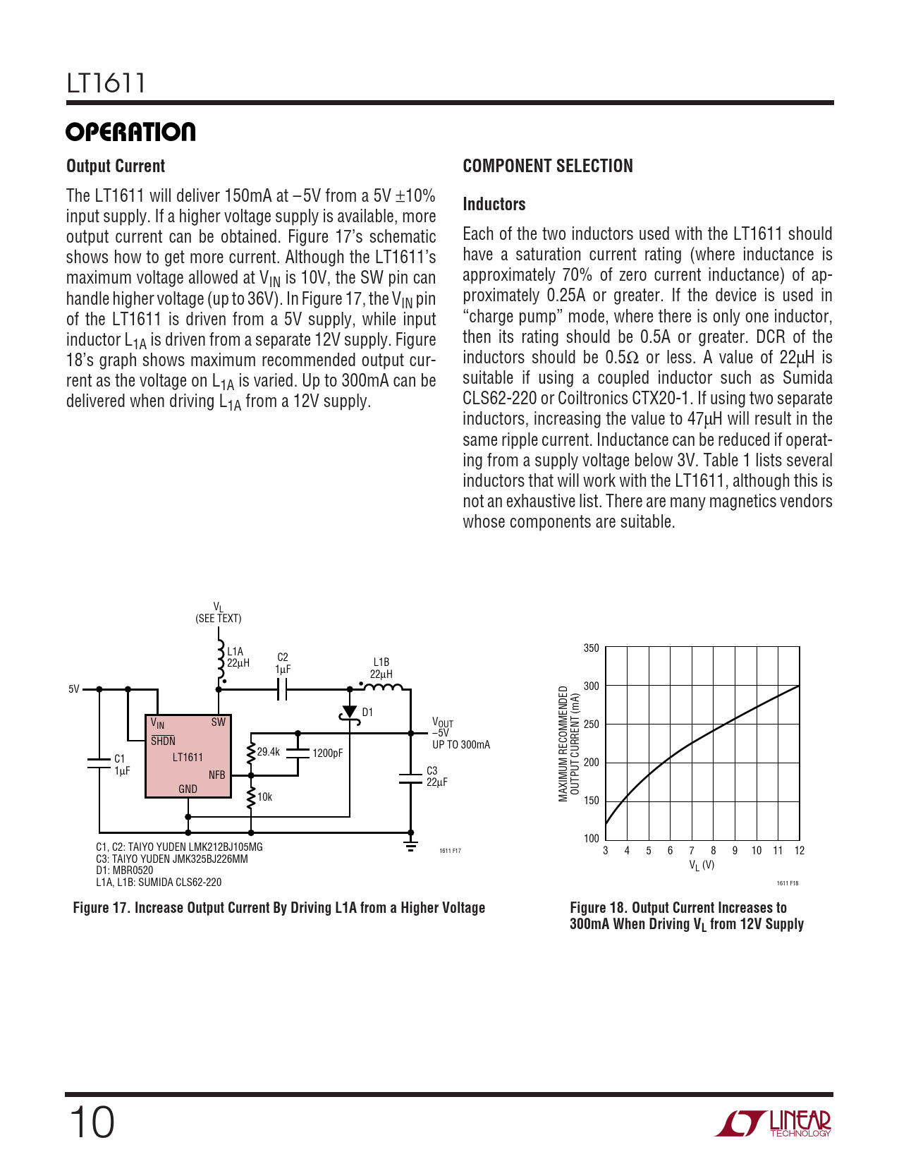 LT1611 UOPERATIOOutput CurrentCOMPONENT SELECTION The LT1611 will deliver 150mA at – 5V from a 5V ±10% Inductors input supply. If a higher voltage supply is available, more output current can be obtained. Figure 17’s schematic Each of the two inductors used with the LT1611 should shows how to get more current. Although the LT1611’s have a saturation current rating (where inductance is maximum voltage allowed at V approximately 70% of zero current inductance) of ap- IN is 10V, the SW pin can handle higher voltage (up to 36V). In Figure 17, the V proximately 0.25A or greater. If the device is used in IN pin of the LT1611 is driven from a 5V supply, while input “charge pump” mode, where there is only one inductor, inductor L then its rating should be 0.5A or greater. DCR of the 1A is driven from a separate 12V supply. Figure 18’s graph shows maximum recommended output cur- inductors should be 0.5Ω or less. A value of 22µH is rent as the voltage on L suitable if using a coupled inductor such as Sumida 1A is varied. Up to 300mA can be delivered when driving L CLS62-220 or Coiltronics CTX20-1. If using two separate 1A from a 12V supply. inductors, increasing the value to 47µH will result in the same ripple current. Inductance can be reduced if operat- ing from a supply voltage below 3V. Table 1 lists several inductors that will work with the LT1611, although this is not an exhaustive list. There are many magnetics vendors whose components are suitable. VL (SEE TEXT) L1A 350 C2 22µH L1B 1µF 22µH 5V 300 D1 VIN SW VOUT 250 –5V SHDN UP TO 300mA 29.4k 1200pF C1 LT1611 200 1µF C3 NFB 22µF GND OUTPUT CURRENT (mA) 10k MAXIMUM RECOMMENDED 150 100 C1, C2: TAIYO YUDEN LMK212BJ105MG 1611 F17 3 4 5 6 7 8 9 10 11 12 C3: TAIYO YUDEN JMK325BJ226MM V D1: MBR0520 L (V) L1A, L1B: SUMIDA CLS62-220 1611 F18 Figure 17. Increase Output Current By Driving L1A from a Higher VoltageFigure 18. Output Current Increases to 300mA When Driving VL from 12V Supply 10