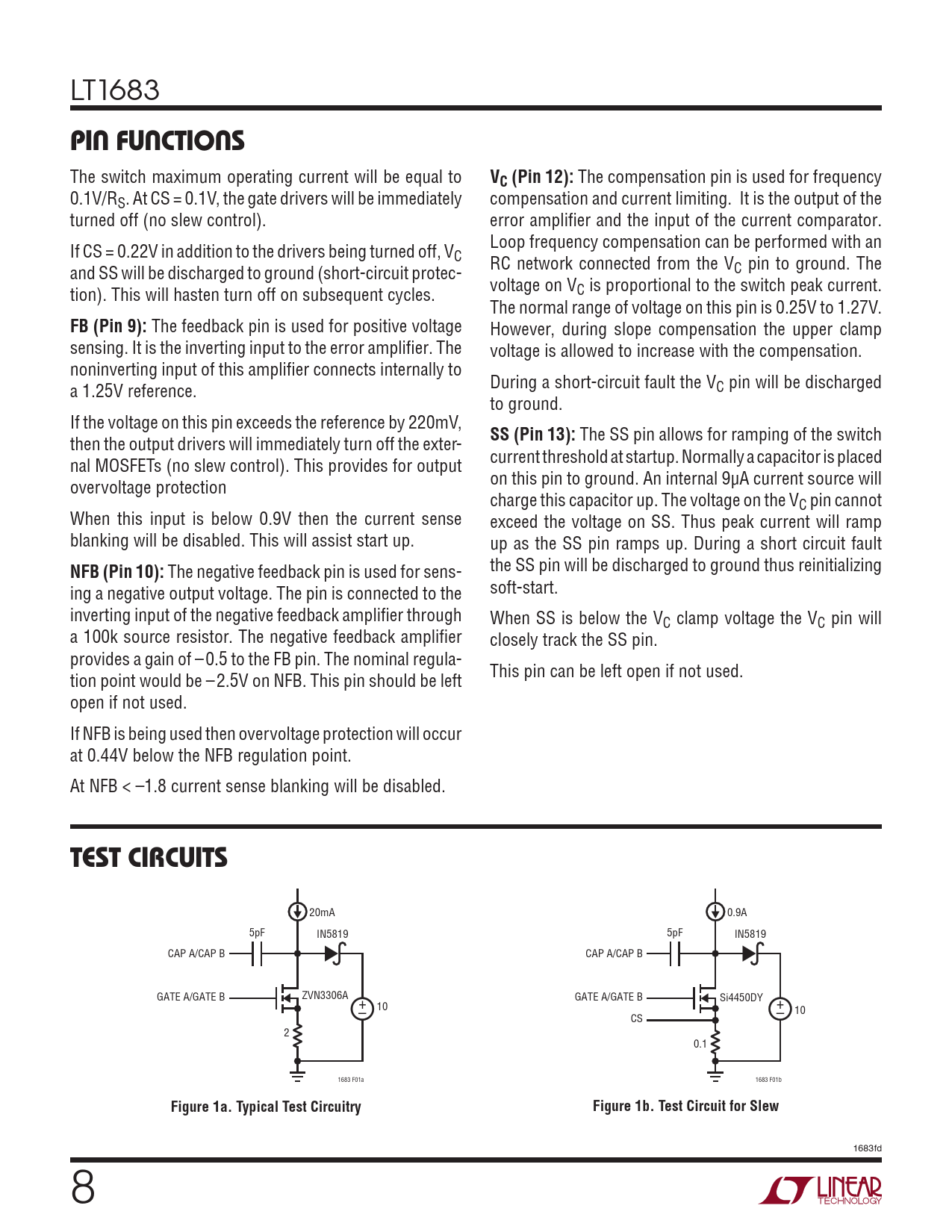 LT1683 PIN FUNCTIONS The switch maximum operating current will be equal to VC (Pin 12): The compensation pin is used for frequency 0.1V/RS. At CS = 0.1V, the gate drivers will be immediately compensation and current limiting. It is the output of the turned off (no slew control). error amplifier and the input of the current comparator. If CS = 0.22V in addition to the drivers being turned off, V Loop frequency compensation can be performed with an C and SS will be discharged to ground (short-circuit protec- RC network connected from the VC pin to ground. The tion). This will hasten turn off on subsequent cycles. voltage on VC is proportional to the switch peak current. The normal range of voltage on this pin is 0.25V to 1.27V. FB (Pin 9): The feedback pin is used for positive voltage However, during slope compensation the upper clamp sensing. It is the inverting input to the error amplifier. The voltage is allowed to increase with the compensation. noninverting input of this amplifier connects internally to a 1.25V reference. During a short-circuit fault the VC pin will be discharged to ground. If the voltage on this pin exceeds the reference by 220mV, then the output drivers will immediately turn off the exter- SS (Pin 13): The SS pin allows for ramping of the switch nal MOSFETs (no slew control). This provides for output current threshold at startup. Normally a capacitor is placed overvoltage protection on this pin to ground. An internal 9µA current source will charge this capacitor up. The voltage on the VC pin cannot When this input is below 0.9V then the current sense exceed the voltage on SS. Thus peak current will ramp blanking will be disabled. This will assist start up. up as the SS pin ramps up. During a short circuit fault NFB (Pin 10): The negative feedback pin is used for sens- the SS pin will be discharged to ground thus reinitializing ing a negative output voltage. The pin is connected to the soft-start. inverting input of the negative feedback amplifier through When SS is below the VC clamp voltage the VC pin will a 100k source resistor. The negative feedback amplifier closely track the SS pin. provides a gain of –0.5 to the FB pin. The nominal regula- tion point would be –2.5V on NFB. This pin should be left This pin can be left open if not used. open if not used. If NFB is being used then overvoltage protection will occur at 0.44V below the NFB regulation point. At NFB < –1.8 current sense blanking will be disabled. TEST CIRCUITS 20mA 0.9A 5pF IN5819 5pF IN5819 CAP A/CAP B CAP A/CAP B GATE A/GATE B ZVN3306A + GATE A/GATE B Si4450DY – 10 +– 10 CS 2 0.1 1683 F01a 1683 F01b Figure 1a. Typical Test CircuitryFigure 1b. Test Circuit for Slew 1683fd 8 Document Outline Features Applications Description Typical Application Absolute Maximum Ratings Pin Configuration Order Information Electrical Characteristics Typical Performance Characteristics Pin Functions Test Circuits Block Diagram Operation Applications Information Typical Applications Package Description Revision History Typical Application Related Parts
