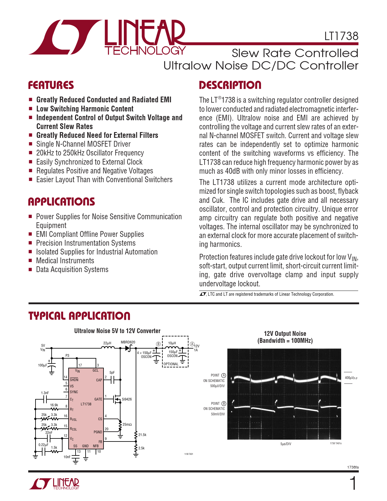 LT1738 Slew Rate Controlled Ultralow Noise DC/DC Controller UFEATURESDESCRIPTIO ■ Greatly Reduced Conducted and Radiated EMI The LT®1738 is a switching regulator controller designed ■ Low Switching Harmonic Content to lower conducted and radiated electromagnetic interfer- ■ Independent Control of Output Switch Voltage and ence (EMI). Ultralow noise and EMI are achieved by Current Slew Rates controlling the voltage and current slew rates of an exter- ■ Greatly Reduced Need for External Filters nal N-channel MOSFET switch. Current and voltage slew ■ Single N-Channel MOSFET Driver rates can be independently set to optimize harmonic ■ 20kHz to 250kHz Oscillator Frequency content of the switching waveforms vs efficiency. The ■ Easily Synchronized to External Clock LT1738 can reduce high frequency harmonic power by as ■ Regulates Positive and Negative Voltages much as 40dB with only minor losses in efficiency. ■ Easier Layout Than with Conventional Switchers The LT1738 utilizes a current mode architecture opti- mized for single switch topologies such as boost, flyback U and Cuk. The IC includes gate drive and all necessary APPLICATIO S oscillator, control and protection circuitry. Unique error ■ Power Supplies for Noise Sensitive Communication amp circuitry can regulate both positive and negative Equipment voltages. The internal oscillator may be synchronized to ■ EMI Compliant Offline Power Supplies an external clock for more accurate placement of switch- ■ Precision Instrumentation Systems ing harmonics. ■ Isolated Supplies for Industrial Automation Protection features include gate drive lockout for low V ■ IN, Medical Instruments soft-start, output current limit, short-circuit current limit- ■ Data Acquisition Systems ing, gate drive overvoltage clamp and input supply undervoltage lockout. , LTC and LT are registered trademarks of Linear Technology Corporation. UTYPICAL APPLICATIOUltralow Noise 5V to 12V Converter12V Output Noise MBRD620 (Bandwidth = 100MHz) 22µH 10 B µH 5V A 12V VIN + + 150 1A 4 µF × 150µF P3 OSCON OSCON + 100µF 17 3 OPTIONAL VIN GCL 5pF POINT A 14 2 400µV SHDN CAP P-P ON SCHEMATIC 5 V5 500µV/DIV 6 SYNC 1.3nF 7 1 C GATE T Si9426 LT1738 POINT B 16.9k 8 RT ON SCHEMATIC 25k 3.3k 50mV/DIV 16 4 RVSL CS 25k 3.3k 15 25mΩ RCSL 20 22nF PGND 12 21.5k VC 9 FB 0.22µF 5µs/DIV 1738 TA01a SS GND NFB 1.5k 2.5k 13 11 10 1738 TA01 10nF 1738fa 1