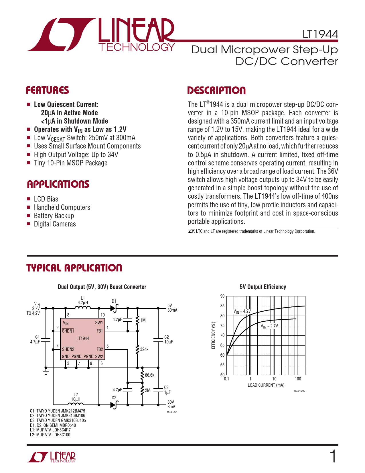 The LT®1944 is a dual micropower step-up DC/DC con-