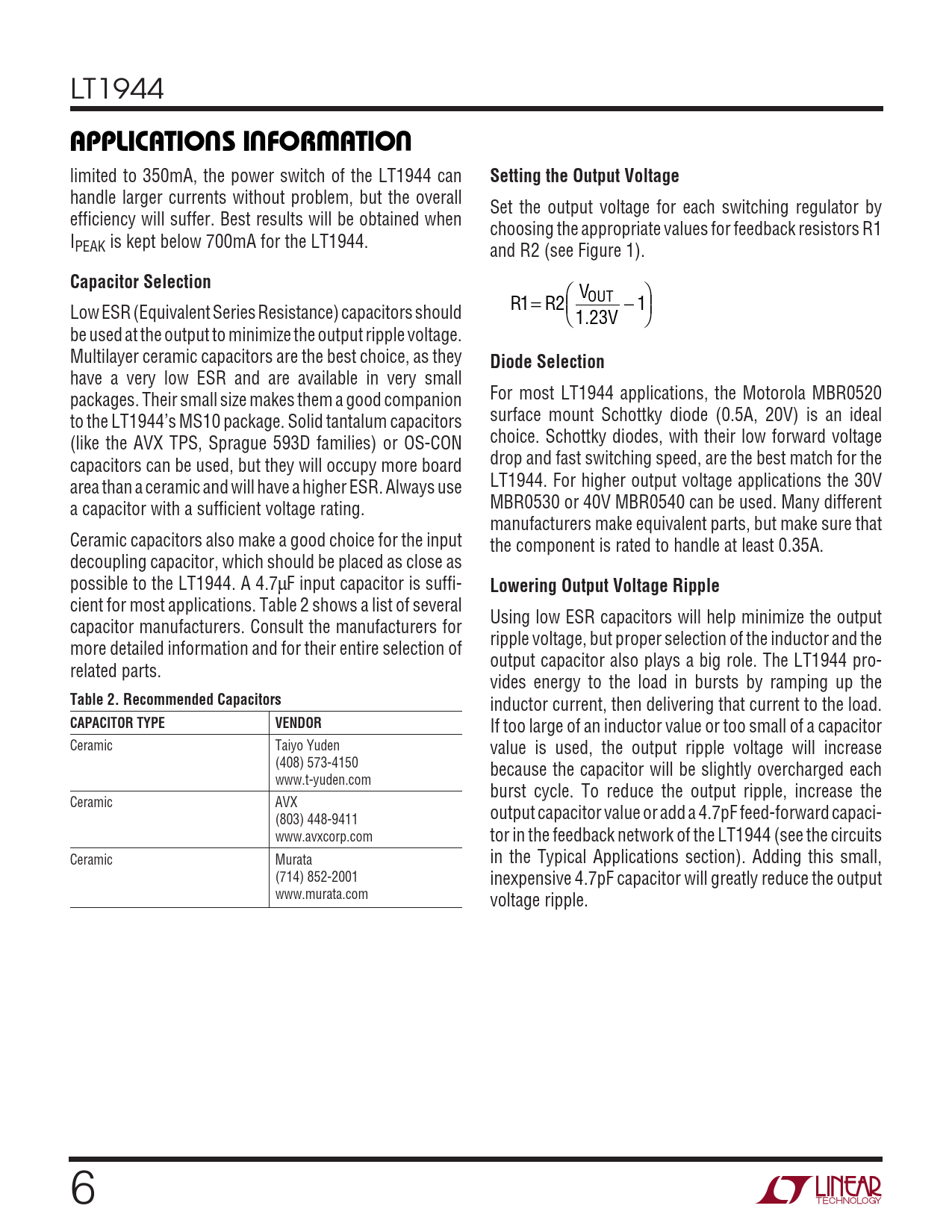 If too large of an inductor value or too small of a capacitor Ceramic Taiyo Yuden value is used, the output ripple voltage will increase (408) 573-4150 because the capacitor will be slightly overcharged each www.t-yuden.com burst cycle. To reduce the output ripple, increase the Ceramic AVX (803) 448-9411 output capacitor value or add a 4.7pF feed-forward capaci- www.avxcorp.com tor in the feedback network of the LT1944 (see the circuits Ceramic Murata in the Typical Applications section). Adding this small, (714) 852-2001 inexpensive 4.7pF capacitor will greatly reduce the output www.murata.com voltage ripple. 6