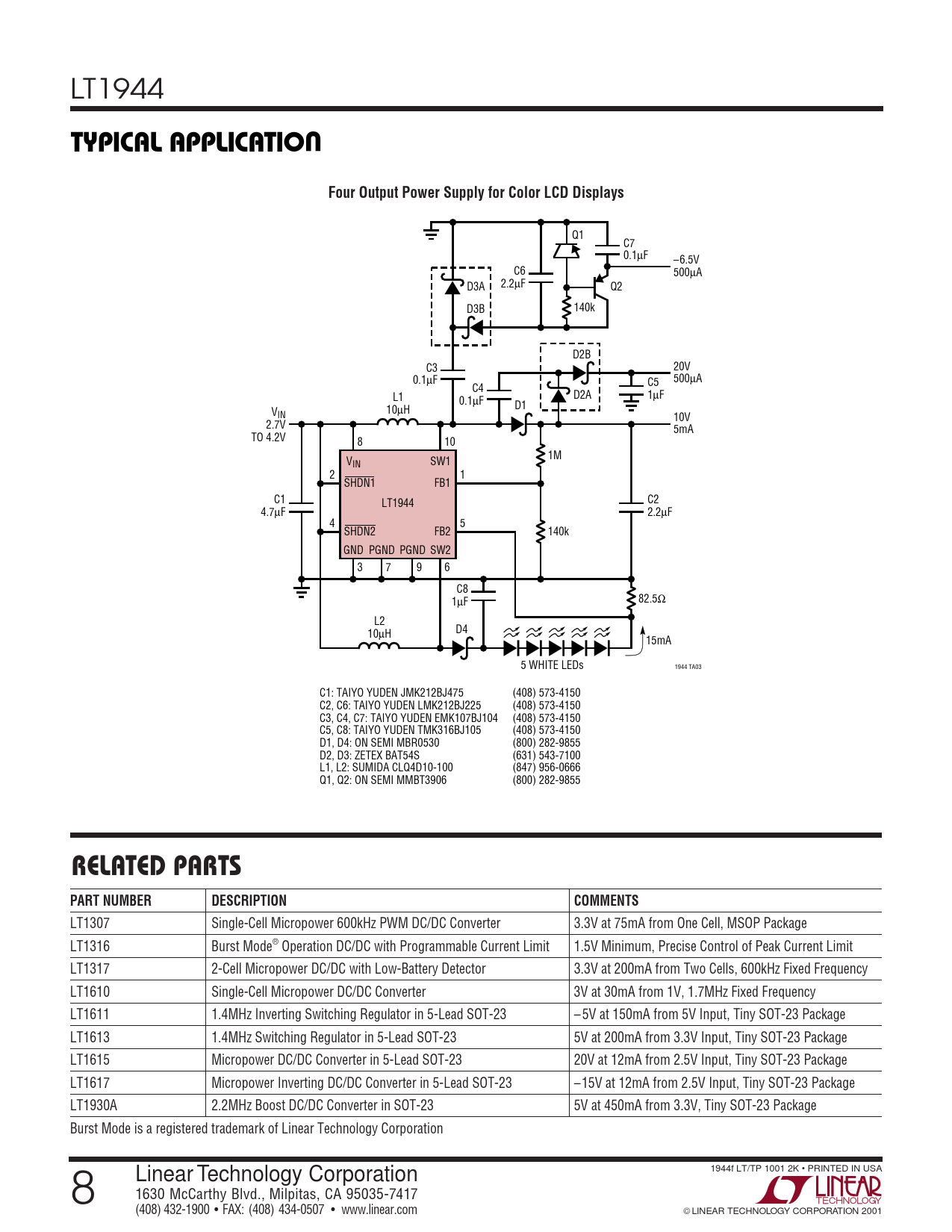 TYPICAL APPLICATIO. Four Output Power Supply for Color LCD Displays. RELATED PARTS. PART NUMBER. DESCRIPTION. COMMENTS