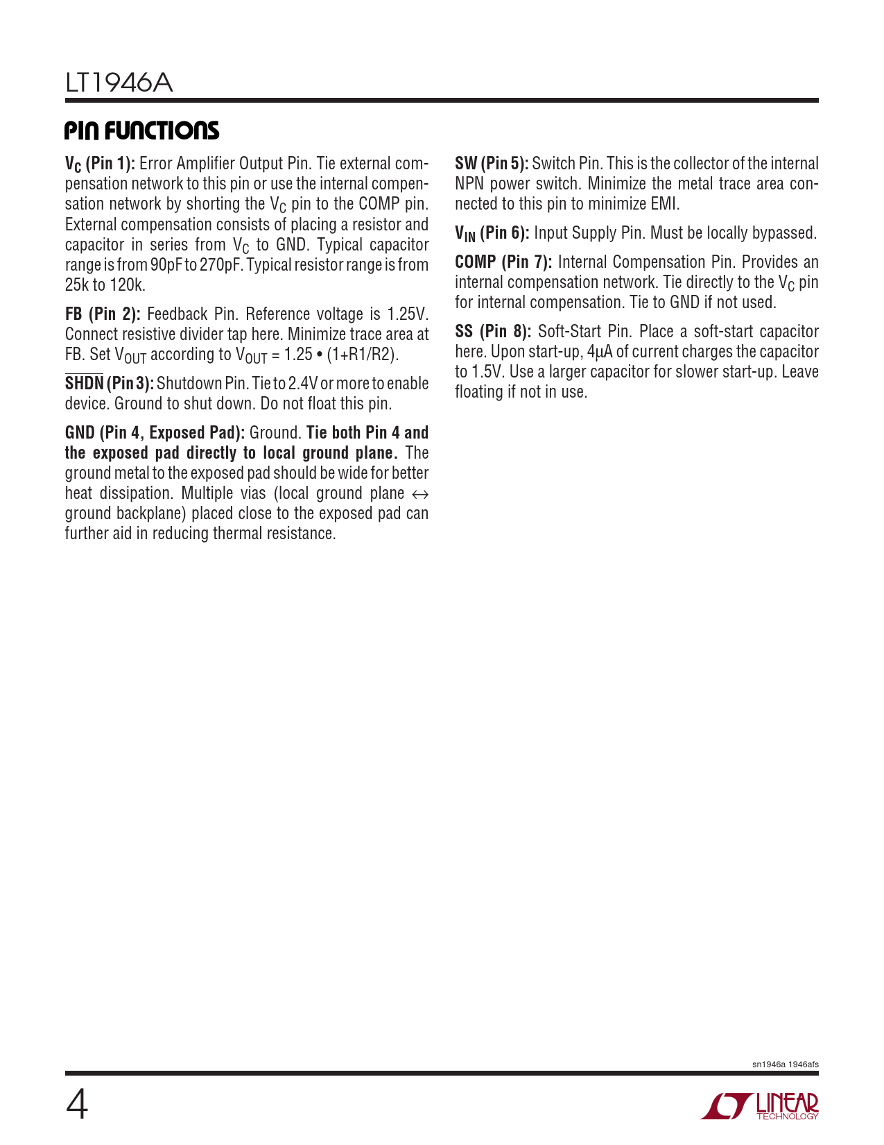 LT1946A UUUPI FU CTIO SVC (Pin 1): Error Amplifier Output Pin. Tie external com- SW (Pin 5): Switch Pin. This is the collector of the internal pensation network to this pin or use the internal compen- NPN power switch. Minimize the metal trace area con- sation network by shorting the VC pin to the COMP pin. nected to this pin to minimize EMI. External compensation consists of placing a resistor and V capacitor in series from V IN (Pin 6): Input Supply Pin. Must be locally bypassed. C to GND. Typical capacitor range is from 90pF to 270pF. Typical resistor range is from COMP (Pin 7): Internal Compensation Pin. Provides an 25k to 120k. internal compensation network. Tie directly to the VC pin for internal compensation. Tie to GND if not used. FB (Pin 2): Feedback Pin. Reference voltage is 1.25V. Connect resistive divider tap here. Minimize trace area at SS (Pin 8): Soft-Start Pin. Place a soft-start capacitor FB. Set V here. Upon start-up, 4µA of current charges the capacitor OUT according to VOUT = 1.25 • (1+R1/R2). to 1.5V. Use a larger capacitor for slower start-up. Leave SHDN (Pin 3): Shutdown Pin. Tie to 2.4V or more to enable floating if not in use. device. Ground to shut down. Do not float this pin. GND (Pin 4, Exposed Pad): Ground. Tie both Pin 4 and the exposed pad directly to local ground plane. The ground metal to the exposed pad should be wide for better heat dissipation. Multiple vias (local ground plane ↔ ground backplane) placed close to the exposed pad can further aid in reducing thermal resistance. sn1946a 1946afs 4
