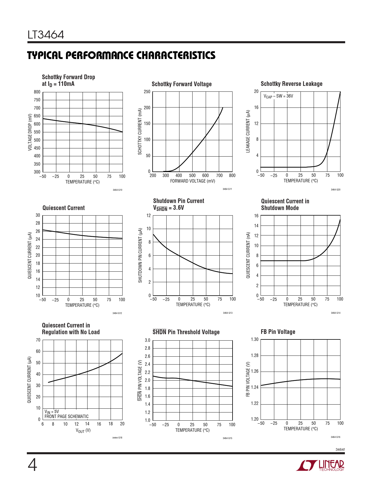 800 250 20 VCAP – SW = 36V 750 700 200 16 µA) 650 600 150 12 550 500 100 8 VOLTAGE DROP (mV) 450 LEAKAGE CURRENT ( SCHOTTKY CURRENT (mA) 400 50 4 350 300 0 0 –50 200 –25 0 25 50 75 100 300 400 500 600 700 800 –50 –25 0 25 50 75 100 TEMPERATURE ( FORWARD VOLTAGE (mV) TEMPERATURE ( °C) °C) 3464 G11 3464 G10 3464 G20