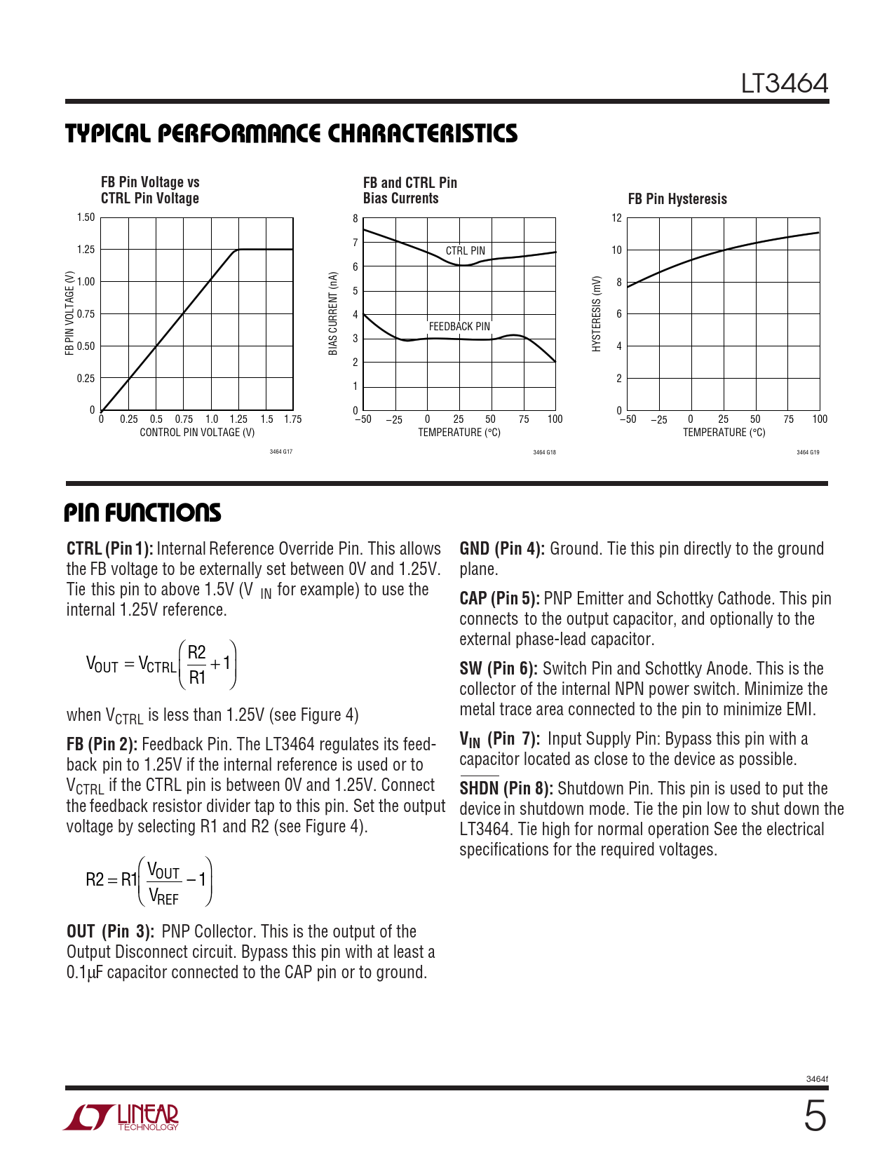1.50 8 12 7 1.25 CTRL PIN 10 6 1.00 8 5 0.75 4 6 FEEDBACK PIN 3 0.50 HYSTERESIS (mV) 4 FB PIN VOLTAGE (V) BIAS CURRENT (nA) 2 0.25 2 1 0 0 0 0 0.25 0.5 0.75 1.0 1.25 1.5 1.75 –50 –25 0 25 50 75 100 –50 –25 0 25 50 75 100 CONTROL PIN VOLTAGE (V) TEMPERATURE (°C) TEMPERATURE (°C) 3464 G17 3464 G18 3464 G19