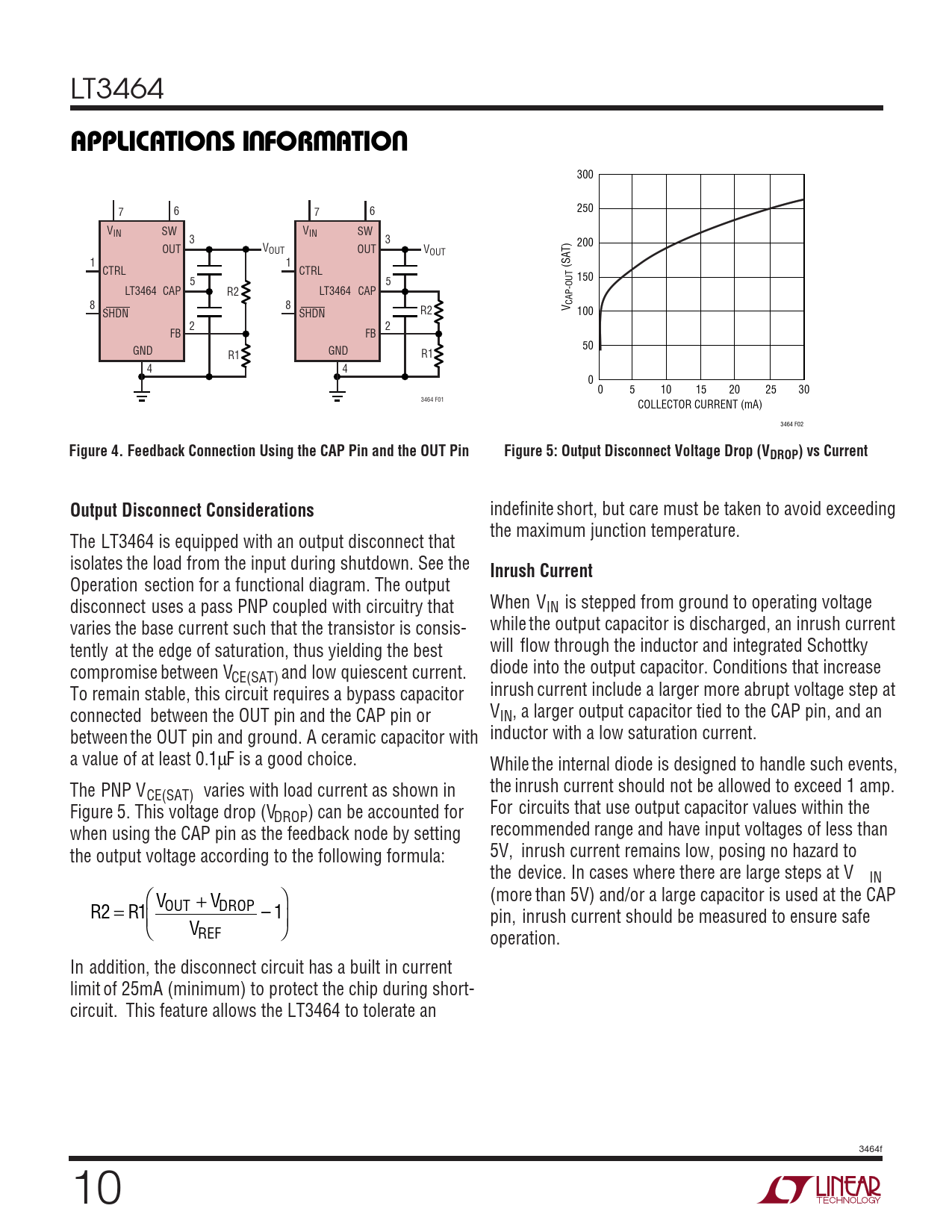 LT3464 UUWUAPPLICATIO S I FOR ATIO 300 7 6 7 6 250 VIN SW V SW 3 IN 3 OUT V 200 OUT OUT VOUT 1 1 CTRL CTRL (SAT) 5 5 150 LT3464 CAP R2 LT3464 CAP 8 8 SHDN SHDN R2 V CAP-OUT 100 2 2 FB FB GND 50 R1 GND R1 4 4 0 0 5 10 15 20 25 30 3464 F01 COLLECTOR CURRENT (mA) 3464 F02 Figure 4. Feedback Connection Using the CAP Pin and the OUT PinFigure 5: Output Disconnect Voltage Drop (VDROP) vs CurrentOutput Disconnect Considerations indefinite short, but care must be taken to avoid exceeding The LT3464 is equipped with an output disconnect that the maximum junction temperature. isolates the load from the input during shutdown. See the Inrush Current Operation section for a functional diagram. The output disconnect uses a pass PNP coupled with circuitry that When VIN is stepped from ground to operating voltage varies the base current such that the transistor is consis- while the output capacitor is discharged, an inrush current tently at the edge of saturation, thus yielding the best will flow through the inductor and integrated Schottky compromise between V diode into the output capacitor. Conditions that increase CE(SAT) and low quiescent current. To remain stable, this circuit requires a bypass capacitor inrush current include a larger more abrupt voltage step at connected between the OUT pin and the CAP pin or VIN, a larger output capacitor tied to the CAP pin, and an between the OUT pin and ground. A ceramic capacitor with inductor with a low saturation current. a value of at least 0.1µF is a good choice. While the internal diode is designed to handle such events, The PNP V the inrush current should not be allowed to exceed 1 amp. CE(SAT) varies with load current as shown in Figure 5. This voltage drop (V For circuits that use output capacitor values within the DROP) can be accounted for when using the CAP pin as the feedback node by setting recommended range and have input voltages of less than the output voltage according to the following formula: 5V, inrush current remains low, posing no hazard to the device. In cases where there are large steps at V IN V (more than 5V) and/or a large capacitor is used at the CAP OUT + V R2 = R DROP 1 – 1 pin, inrush current should be measured to ensure safe VREF operation. In addition, the disconnect circuit has a built in current limit of 25mA (minimum) to protect the chip during short- circuit. This feature allows the LT3464 to tolerate an 3464f 10