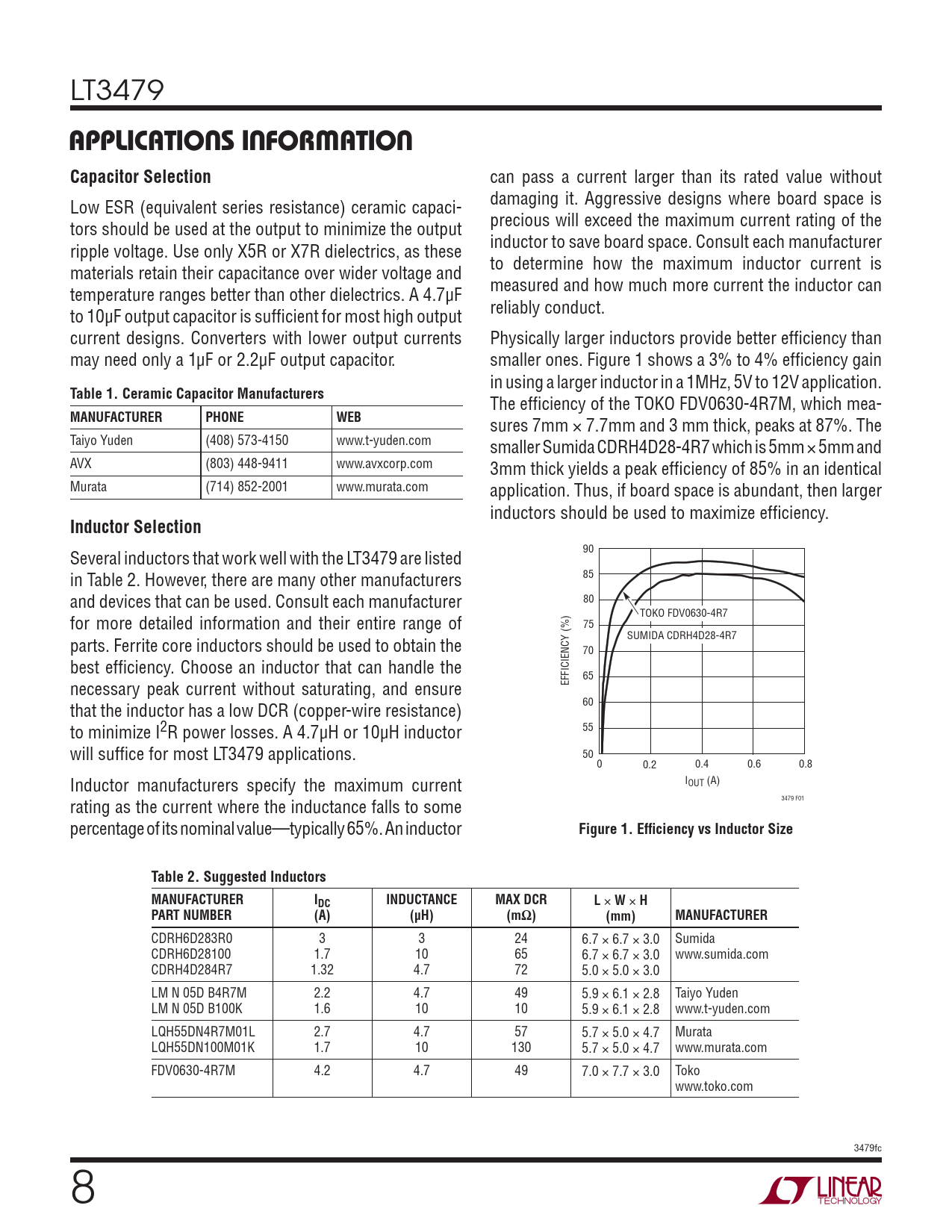 90 Several inductors that work well with the LT3479 are listed in Table 2. However, there are many other manufacturers 85 and devices that can be used. Consult each manufacturer 80 TOKO FDV0630-4R7 for more detailed information and their entire range of 75 SUMIDA CDRH4D28-4R7 parts. Ferrite core inductors should be used to obtain the 70 best effi ciency. Choose an inductor that can handle the 65 necessary peak current without saturating, and ensure EFFICIENCY (%) 60 that the inductor has a low DCR (copper-wire resistance) to minimize I2R power losses. A 4.7μH or 10μH inductor 55 will suffi ce for most LT3479 applications. 50 0 0.2 0.4 0.6 0.8 Inductor manufacturers specify the maximum current IOUT (A) 3479 F01 rating as the current where the inductance falls to some percentage of its nominal value—typically 65%. An inductor