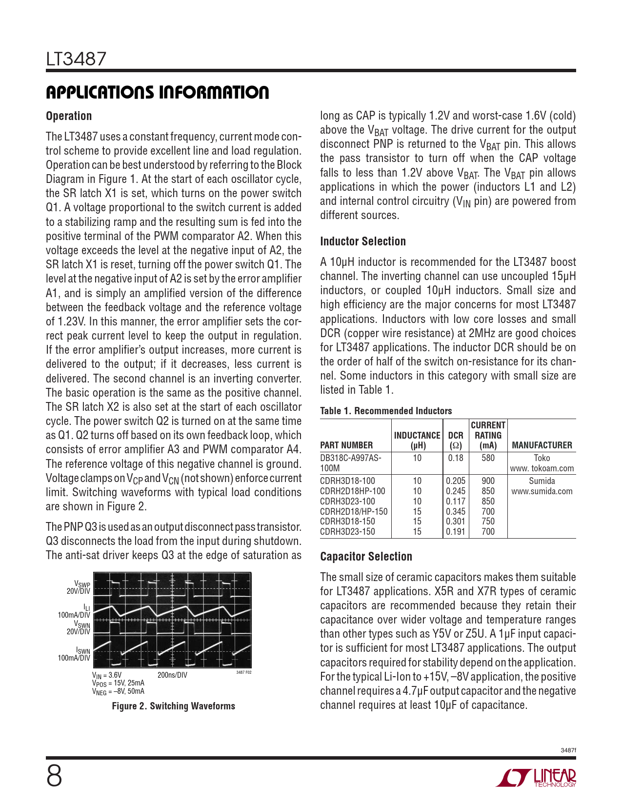 long as CAP is typically 1.2V and worst-case 1.6V (cold) above the V The LT3487 uses a constant frequency, current mode con- BAT voltage. The drive current for the output disconnect PNP is returned to the V trol scheme to provide excellent line and load regulation. BAT pin. This allows the pass transistor to turn off when the CAP voltage Operation can be best understood by referring to the Block falls to less than 1.2V above V Diagram in Figure 1. At the start of each oscillator cycle, BAT. The VBAT pin allows applications in which the power (inductors L1 and L2) the SR latch X1 is set, which turns on the power switch and internal control circuitry (V Q1. A voltage proportional to the switch current is added IN pin) are powered from different sources. to a stabilizing ramp and the resulting sum is fed into the positive terminal of the PWM comparator A2. When this