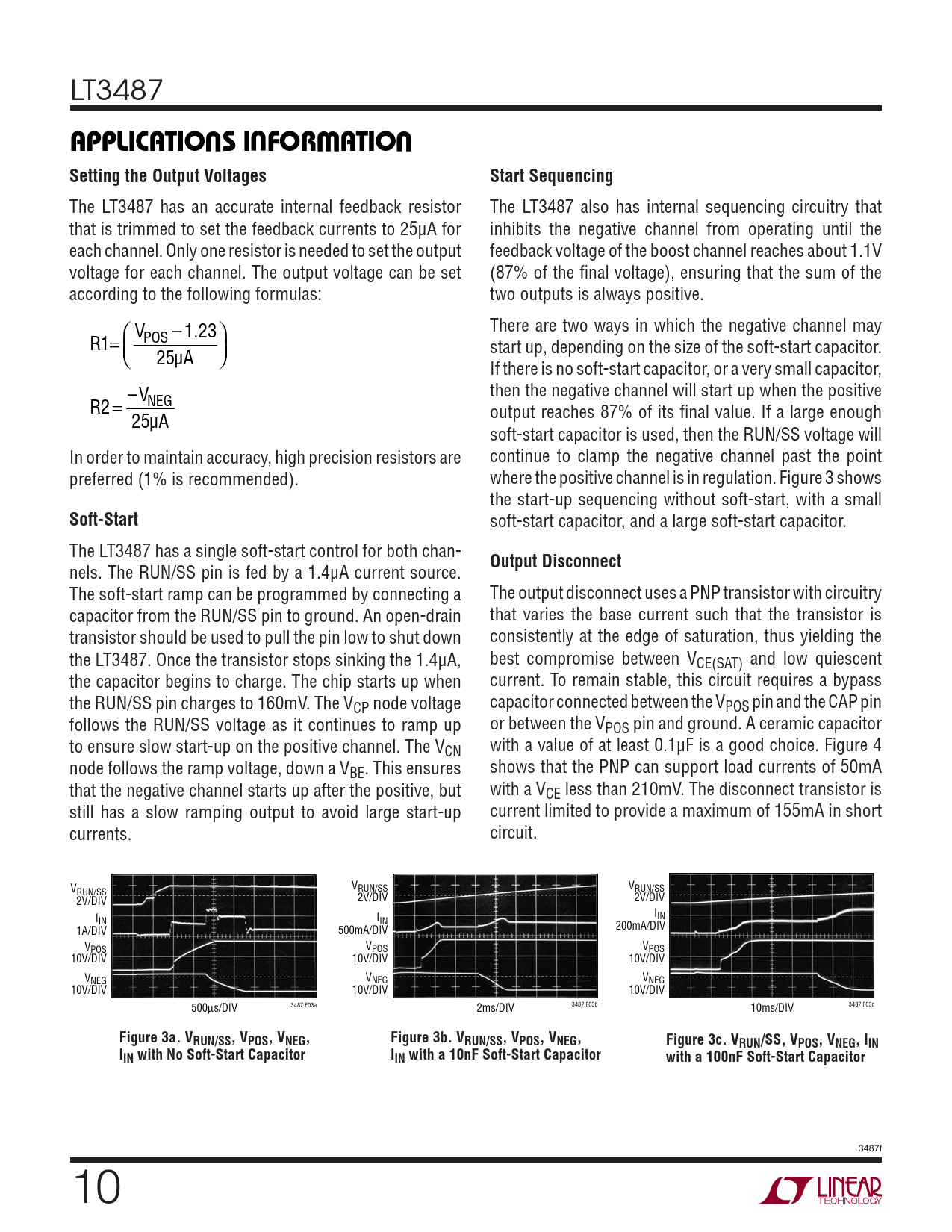 nels. The RUN/SS pin is fed by a 1.4μA current source. The soft-start ramp can be programmed by connecting a The output disconnect uses a PNP transistor with circuitry capacitor from the RUN/SS pin to ground. An open-drain that varies the base current such that the transistor is transistor should be used to pull the pin low to shut down consistently at the edge of saturation, thus yielding the the LT3487. Once the transistor stops sinking the 1.4μA, best compromise between VCE(SAT) and low quiescent the capacitor begins to charge. The chip starts up when current. To remain stable, this circuit requires a bypass the RUN/SS pin charges to 160mV. The VCP node voltage capacitor connected between the VPOS pin and the CAP pin follows the RUN/SS voltage as it continues to ramp up or between the VPOS pin and ground. A ceramic capacitor to ensure slow start-up on the positive channel. The VCN with a value of at least 0.1μF is a good choice. Figure 4 node follows the ramp voltage, down a VBE. This ensures shows that the PNP can support load currents of 50mA that the negative channel starts up after the positive, but with a VCE less than 210mV. The disconnect transistor is still has a slow ramping output to avoid large start-up current limited to provide a maximum of 155mA in short currents. circuit. V V V RUN/SS RUN/SS RUN/SS 2V/DIV 2V/DIV 2V/DIV I I IN IN IIN 200mA/DIV 1A/DIV 500mA/DIV VPOS VPOS VPOS 10V/DIV 10V/DIV 10V/DIV VNEG VNEG VNEG 10V/DIV 10V/DIV 10V/DIV 500µs/DIV 3487 F03a 2ms/DIV 3487 F03b 10ms/DIV 3487 F03c
