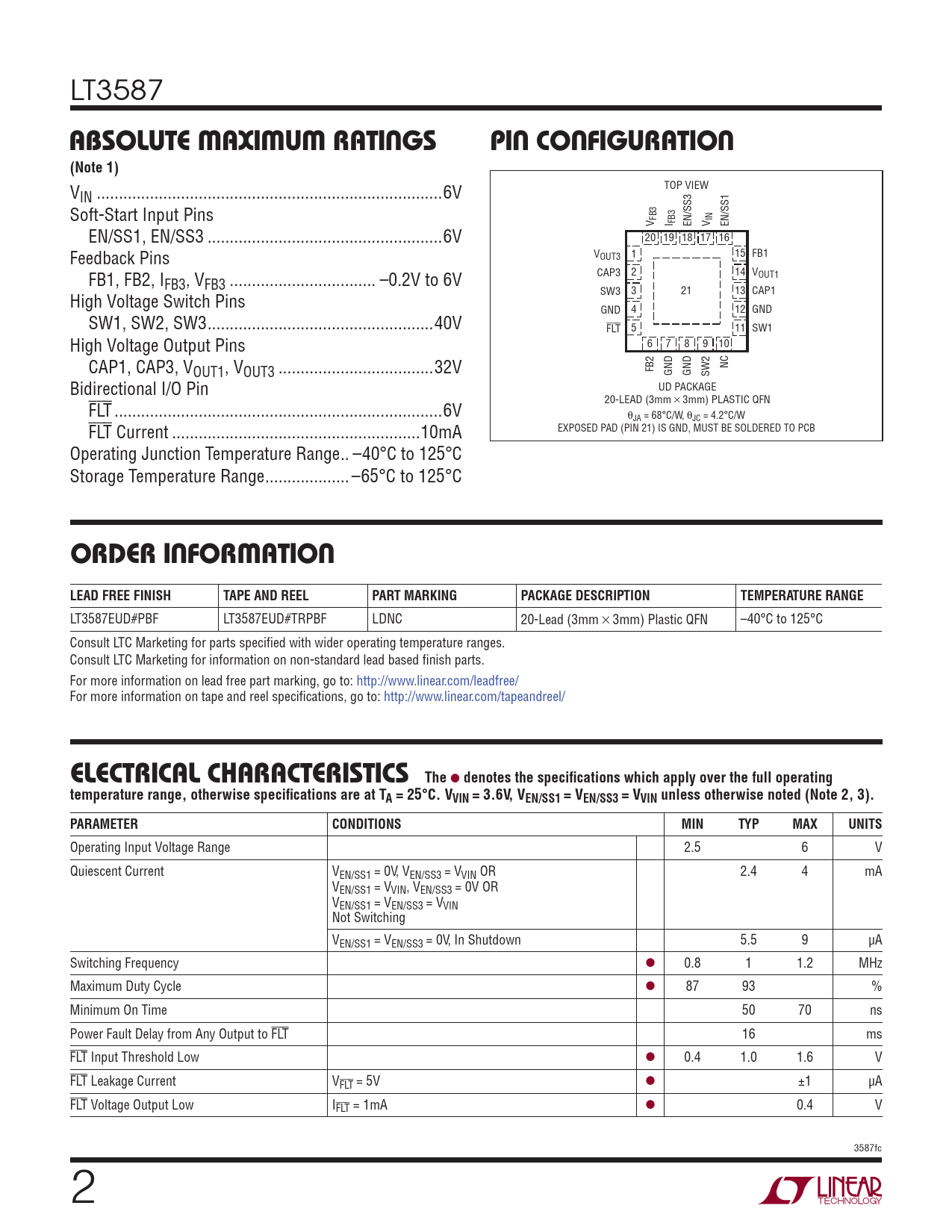 LT3587EUD#PBF LT3587EUD#TRPBF LDNC 20-Lead (3mm × 3mm) Plastic QFN –40°C to 125°C Consult LTC Marketing for parts specifi ed with wider operating temperature ranges. Consult LTC Marketing for information on non-standard lead based fi nish parts. For more information on lead free part marking, go to: http://www.linear.com/leadfree/ For more information on tape and reel specifi cations, go to: http://www.linear.com/tapeandreel/