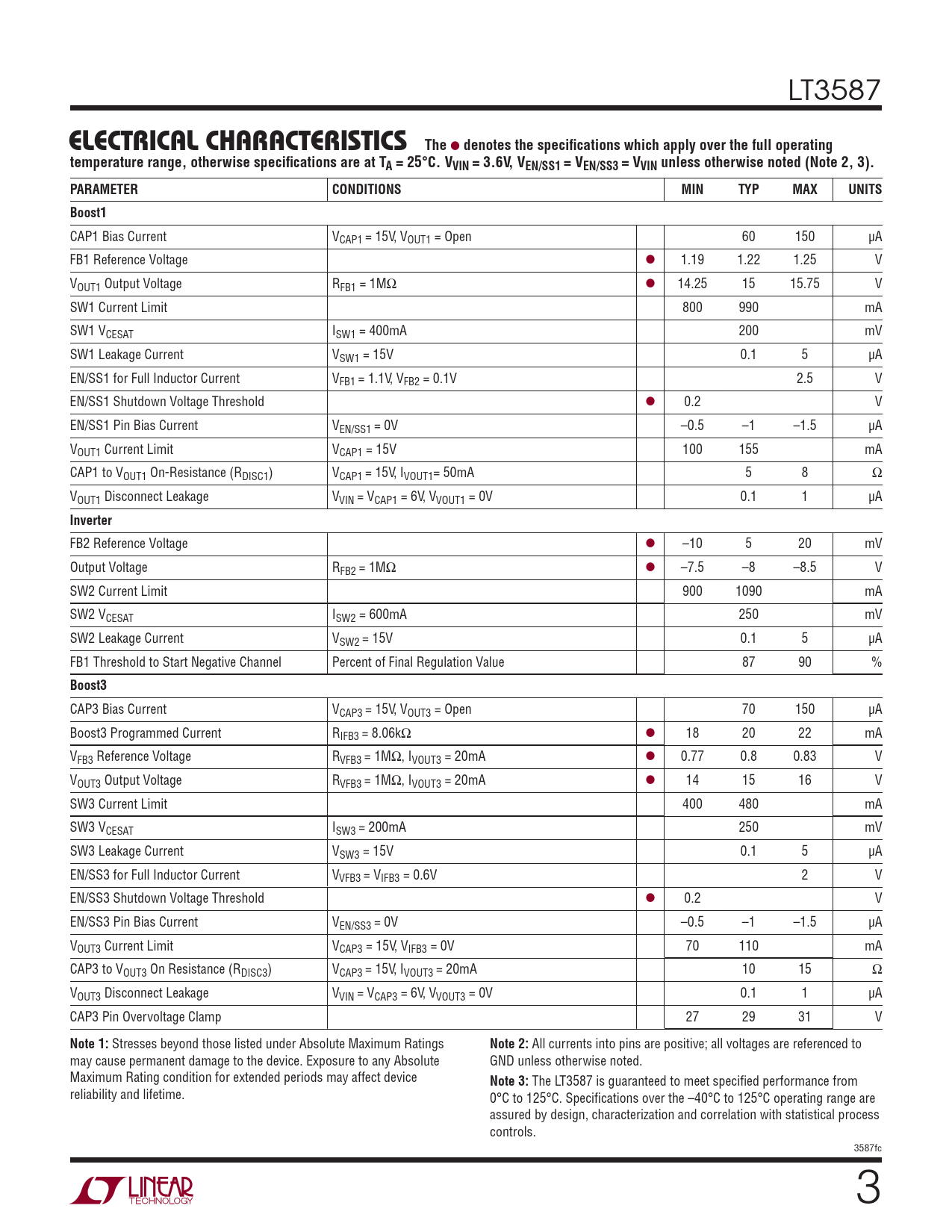 The LT3587 is guaranteed to meet specifi ed performance from reliability and lifetime. 0°C to 125°C. Specifi cations over the –40°C to 125°C operating range are assured by design, characterization and correlation with statistical process controls. 3587fc 3
