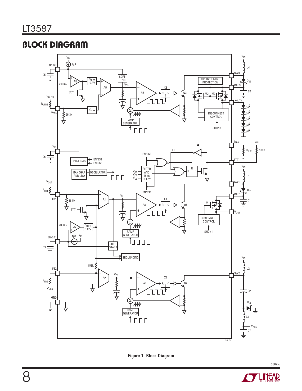 V V IN IN EN/SS3 1μA L4 SW3 C5 + SOFT- V + OVERVOLTAGE A8 REF START DS3 PROTECTION 200mV – 0.8V VC3 CAP3 A5 – X3 FLT – C4 A6 R Q Q3 M2 M3 S VOUT3 + VOUT3 RVFB3 VMAX Σ VFB3 56.3k DISCONNECT CONTROL RAMP GENERATOR SHDN3 IFB3 VIN VIN FLT RIFB3 100k EN/SS3 C6 EN/SS1 FLT PTAT BIAS EN/SS3 VIN FILTER R VC1 BANDGAP OSCILLATOR AND S Q VC2 AND LDO 16ms L1 VC3 DELAY VOUT1 SW1 RFB1 – DS1 EN/SS1 CAP1 VC1 FB1 A1 – X1 88.5k C1 + M1 A3 R Q Q1 S FLT + VOUT1 DISCONNECT Σ CONTROL 200mV – V A7 REF + 1.22V RAMP SHDN1 V GENERATOR 1μA IN EN/SS1 SOFT- C3 START SEQUENCING VIN 153k FB2 – L2 SW2 VC2 A2 – X2 RFB2 + A4 R Q Q2 S VNEG + C2 GND Σ DS2 RAMP GENERATOR L3 VNEG C7 3587 F01