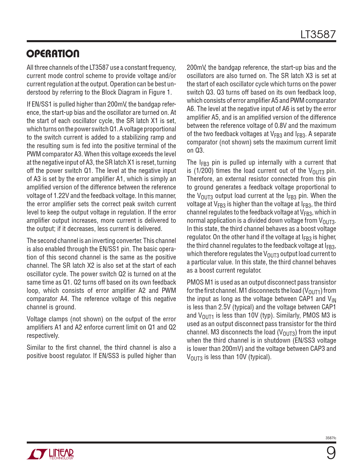 All three channels of the LT3587 use a constant frequency, 200mV, the bandgap reference, the start-up bias and the current mode control scheme to provide voltage and/or oscillators are also turned on. The SR latch X3 is set at current regulation at the output. Operation can be best un- the start of each oscillator cycle which turns on the power derstood by referring to the Block Diagram in Figure 1. switch Q3. Q3 turns off based on its own feedback loop, which consists of error amplifi er A5 and PWM comparator If EN/SS1 is pulled higher than 200mV, the bandgap refer- A6. The level at the negative input of A6 is set by the error ence, the start-up bias and the oscillator are turned on. At amplifi er A5, and is an amplifi ed version of the difference the start of each oscillator cycle, the SR latch X1 is set, between the reference voltage of 0.8V and the maximum which turns on the power switch Q1. A voltage proportional of the two feedback voltages at V to the switch current is added to a stabilizing ramp and FB3 and IFB3. A separate comparator (not shown) sets the maximum current limit the resulting sum is fed into the positive terminal of the on Q3. PWM comparator A3. When this voltage exceeds the level at the negative input of A3, the SR latch X1 is reset, turning The IFB3 pin is pulled up internally with a current that off the power switch Q1. The level at the negative input is (1/200) times the load current out of the VOUT3 pin. of A3 is set by the error amplifi er A1, which is simply an Therefore, an external resistor connected from this pin amplifi ed version of the difference between the reference to ground generates a feedback voltage proportional to voltage of 1.22V and the feedback voltage. In this manner, the VOUT3 output load current at the IFB3 pin. When the the error amplifi er sets the correct peak switch current voltage at VFB3 is higher than the voltage at IFB3, the third level to keep the output voltage in regulation. If the error channel regulates to the feedback voltage at VFB3, which in amplifi er output increases, more current is delivered to normal application is a divided down voltage from VOUT3. the output; if it decreases, less current is delivered. In this state, the third channel behaves as a boost voltage regulator. On the other hand if the voltage at I The second channel is an inverting converter. This channel FB3 is higher, the third channel regulates to the feedback voltage at I is also enabled through the EN/SS1 pin. The basic opera- FB3, which therefore regulates the V tion of this second channel is the same as the positive OUT3 output load current to a particular value. In this state, the third channel behaves channel. The SR latch X2 is also set at the start of each as a boost current regulator. oscillator cycle. The power switch Q2 is turned on at the same time as Q1. Q2 turns off based on its own feedback PMOS M1 is used as an output disconnect pass transistor loop, which consists of error amplifi er A2 and PWM for the fi rst channel. M1 disconnects the load (VOUT1) from comparator A4. The reference voltage of this negative the input as long as the voltage between CAP1 and VIN channel is ground. is less than 2.5V (typical) and the voltage between CAP1 and V Voltage clamps (not shown) on the output of the error OUT1 is less than 10V (typ). Similarly, PMOS M3 is used as an output disconnect pass transistor for the third amplifi ers A1 and A2 enforce current limit on Q1 and Q2 channel. M3 disconnects the load (V respectively. OUT3) from the input when the third channel is in shutdown (EN/SS3 voltage Similar to the fi rst channel, the third channel is also a is lower than 200mV) and the voltage between CAP3 and positive boost regulator. If EN/SS3 is pulled higher than VOUT3 is less than 10V (typical). 3587fc 9