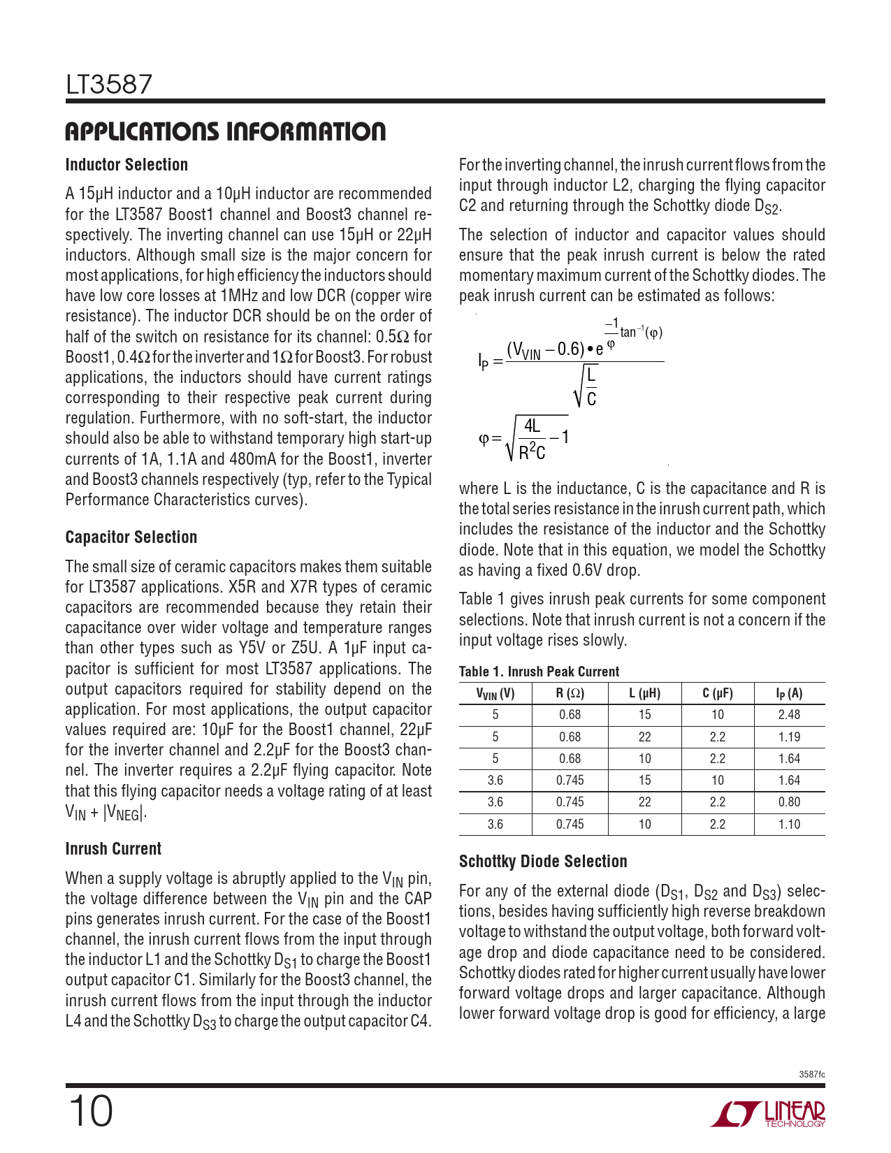 APPLICATIONS INFORMATION. Inductor Selection. Capacitor Selection. Table 1. Inrush Peak Current. VVIN (V). R (. L (μH). C (μF). IP (A)