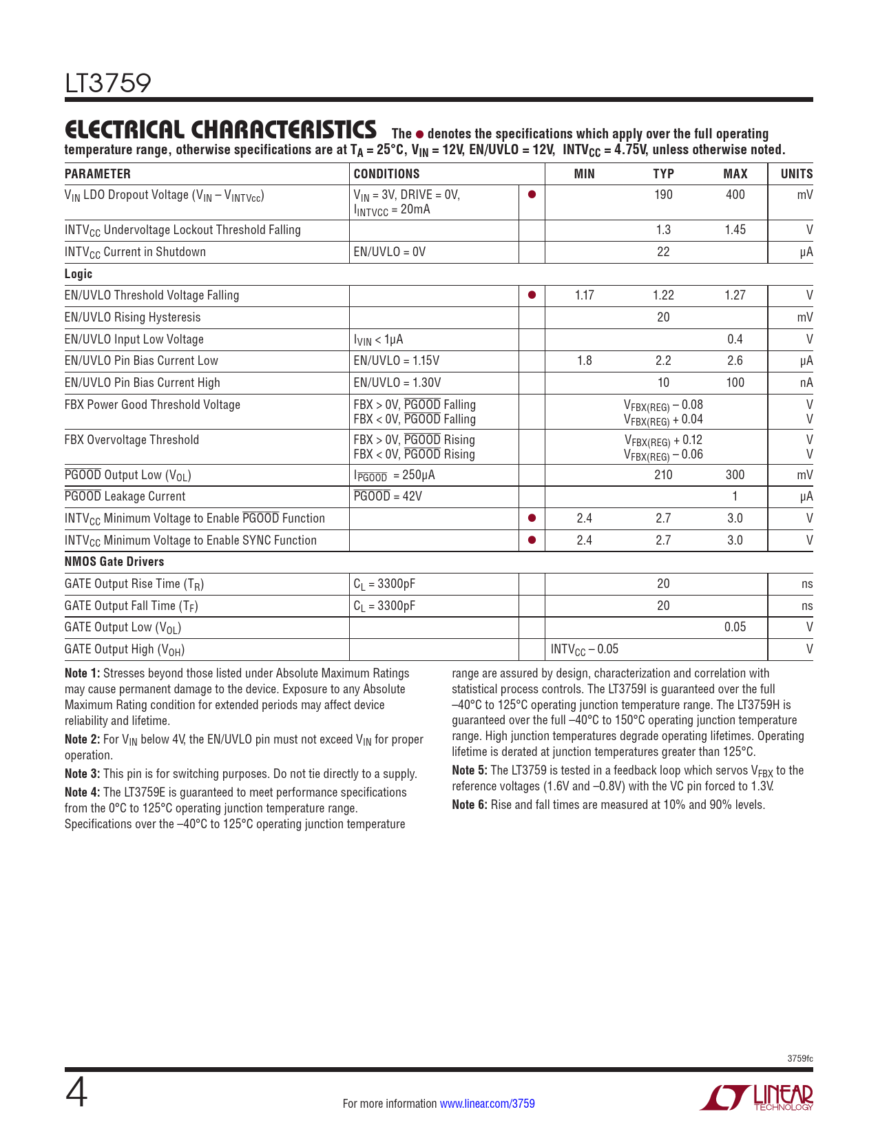 LT3759 ELECTRICAL CHARACTERISTICSThe l denotes the specifications which apply over the full operatingtemperature range, otherwise specifications are at TA = 25°C, VIN = 12V, EN/UVLO = 12V, INTVCC = 4.75V, unless otherwise noted. PARAMETERCONDITIONSMINTYPMAXUNITS VIN LDO Dropout Voltage (VIN – VINTVcc) VIN = 3V, DRIVE = 0V, l 190 400 mV IINTVCC = 20mA INTVCC Undervoltage Lockout Threshold Falling 1.3 1.45 V INTVCC Current in Shutdown EN/UVLO = 0V 22 µA Logic EN/UVLO Threshold Voltage Fal ing l 1.17 1.22 1.27 V EN/UVLO Rising Hysteresis 20 mV EN/UVLO Input Low Voltage IVIN < 1μA 0.4 V EN/UVLO Pin Bias Current Low EN/UVLO = 1.15V 1.8 2.2 2.6 µA EN/UVLO Pin Bias Current High EN/UVLO = 1.30V 10 100 nA FBX Power Good Threshold Voltage FBX > 0V, PGOOD Falling VFBX(REG) – 0.08 V FBX < 0V, PGOOD Falling VFBX(REG) + 0.04 V FBX Overvoltage Threshold FBX > 0V, PGOOD Rising VFBX(REG) + 0.12 V FBX < 0V, PGOOD Rising VFBX(REG) – 0.06 V PGOOD Output Low (VOL) IPGOOD = 250µA 210 300 mV PGOOD Leakage Current PGOOD = 42V 1 µA INTVCC Minimum Voltage to Enable PGOOD Function l 2.4 2.7 3.0 V INTVCC Minimum Voltage to Enable SYNC Function l 2.4 2.7 3.0 V NMOS Gate Drivers GATE Output Rise Time (TR) CL = 3300pF 20 ns GATE Output Fall Time (TF) CL = 3300pF 20 ns GATE Output Low (VOL) 0.05 V GATE Output High (VOH) INTVCC – 0.05 V Note 1: Stresses beyond those listed under Absolute Maximum Ratings range are assured by design, characterization and correlation with may cause permanent damage to the device. Exposure to any Absolute statistical process controls. The LT3759I is guaranteed over the full Maximum Rating condition for extended periods may affect device –40°C to 125°C operating junction temperature range. The LT3759H is reliability and lifetime. guaranteed over the full –40°C to 150°C operating junction temperature Note 2: For V range. High junction temperatures degrade operating lifetimes. Operating IN below 4V, the EN/UVLO pin must not exceed VIN for proper operation. lifetime is derated at junction temperatures greater than 125°C. Note 3: This pin is for switching purposes. Do not tie directly to a supply. Note 5: The LT3759 is tested in a feedback loop which servos VFBX to the Note 4: The LT3759E is guaranteed to meet performance specifications reference voltages (1.6V and –0.8V) with the VC pin forced to 1.3V. from the 0°C to 125°C operating junction temperature range. Note 6: Rise and fall times are measured at 10% and 90% levels. Specifications over the –40°C to 125°C operating junction temperature 3759fc 4 For more information www.linear.com/3759 Document Outline Features Applications Description Typical Application Absolute Maximum Ratings Pin Configuration Order Information Electrical Characteristics Typical Performance Characteristics Pin Functions Block Diagram Applications Information Typical Applications Package Description Revision History Related Parts
