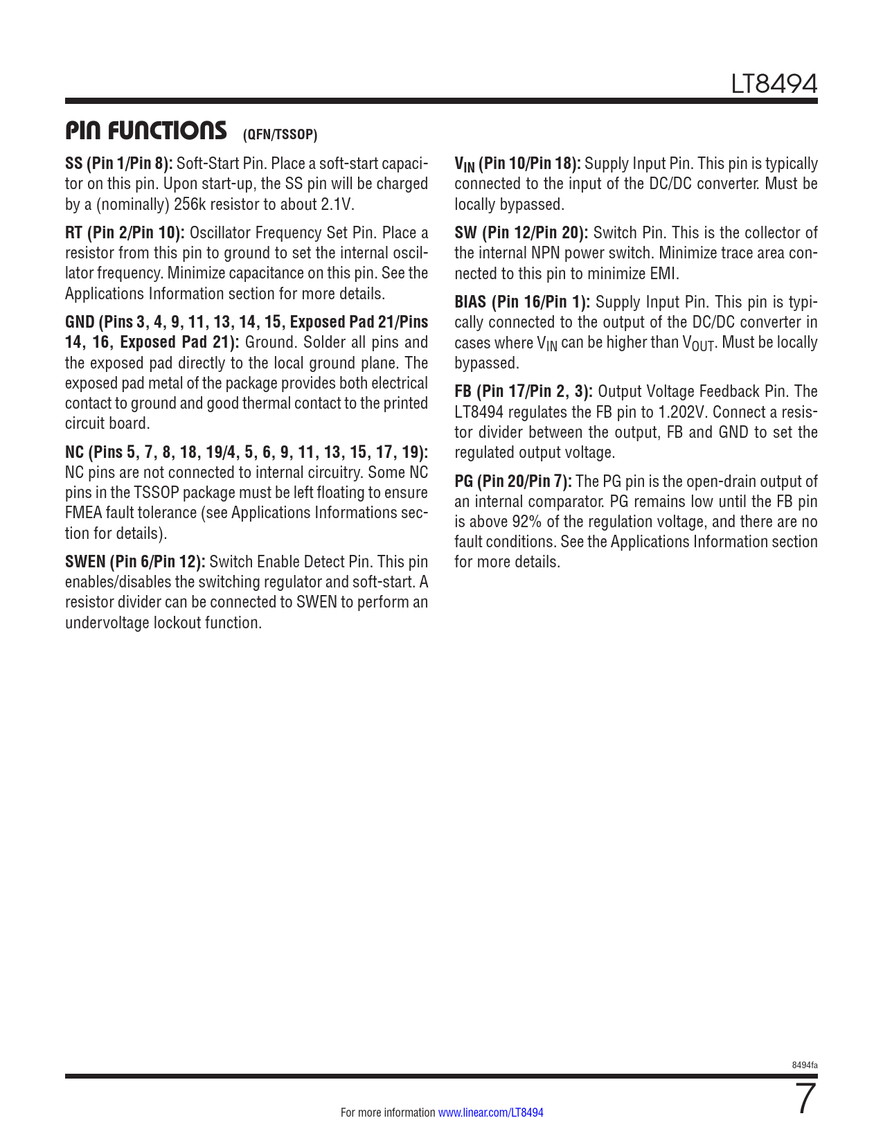 LT8494 PIN FUNCTIONS (QFN/TSSOP) SS (Pin 1/Pin 8): Soft-Start Pin. Place a soft-start capaci- VIN (Pin 10/Pin 18): Supply Input Pin. This pin is typically tor on this pin. Upon start-up, the SS pin will be charged connected to the input of the DC/DC converter. Must be by a (nominally) 256k resistor to about 2.1V. locally bypassed. RT (Pin 2/Pin 10): Oscillator Frequency Set Pin. Place a SW (Pin 12/Pin 20): Switch Pin. This is the collector of resistor from this pin to ground to set the internal oscil- the internal NPN power switch. Minimize trace area con- lator frequency. Minimize capacitance on this pin. See the nected to this pin to minimize EMI. Applications Information section for more details. BIAS (Pin 16/Pin 1): Supply Input Pin. This pin is typi- GND (Pins 3, 4, 9, 11, 13, 14, 15, Exposed Pad 21/Pins cally connected to the output of the DC/DC converter in 14, 16, Exposed Pad 21): Ground. Solder all pins and cases where VIN can be higher than VOUT. Must be locally the exposed pad directly to the local ground plane. The bypassed. exposed pad metal of the package provides both electrical FB (Pin 17/Pin 2, 3): Output Voltage Feedback Pin. The contact to ground and good thermal contact to the printed LT8494 regulates the FB pin to 1.202V. Connect a resis- circuit board. tor divider between the output, FB and GND to set the NC (Pins 5, 7, 8, 18, 19/4, 5, 6, 9, 11, 13, 15, 17, 19): regulated output voltage. NC pins are not connected to internal circuitry. Some NC PG (Pin 20/Pin 7): The PG pin is the open-drain output of pins in the TSSOP package must be left floating to ensure an internal comparator. PG remains low until the FB pin FMEA fault tolerance (see Applications Informations sec- is above 92% of the regulation voltage, and there are no tion for details). fault conditions. See the Applications Information section SWEN (Pin 6/Pin 12): Switch Enable Detect Pin. This pin for more details. enables/disables the switching regulator and soft-start. A resistor divider can be connected to SWEN to perform an undervoltage lockout function. 8494fa For more information www.linear.com/LT8494 7 Document Outline Features Applications Typical Application Description Absolute Maximum Ratings Pin Configuration Order Information Electrical Characteristics Typical Performance Characteristics Pin Functions Block Diagram Operation Applications Information Typical Application Related Parts