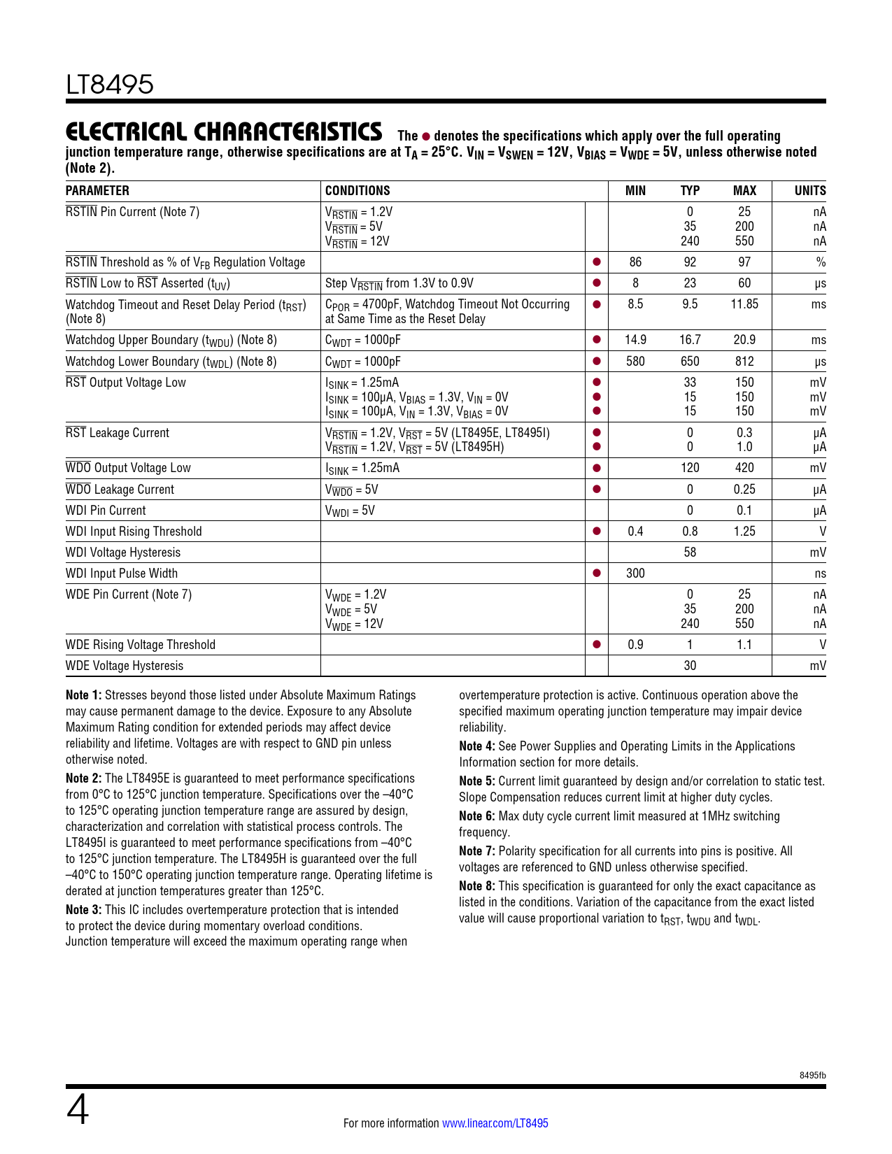 RSTIN Pin Current (Note 7) VRSTIN = 1.2V 0 25 nA VRSTIN = 5V 35 200 nA VRSTIN = 12V 240 550 nA RSTIN Threshold as % of VFB Regulation Voltage l 86 92 97 % RSTIN Low to RST Asserted (tUV) Step VRSTIN from 1.3V to 0.9V l 8 23 60 µs Watchdog Timeout and Reset Delay Period (tRST) CPOR = 4700pF, Watchdog Timeout Not Occurring l 8.5 9.5 11.85 ms (Note 8) at Same Time as the Reset Delay Watchdog Upper Boundary (tWDU) (Note 8) CWDT = 1000pF l 14.9 16.7 20.9 ms Watchdog Lower Boundary (tWDL) (Note 8) CWDT = 1000pF l 580 650 812 µs RST Output Voltage Low ISINK = 1.25mA l 33 150 mV ISINK = 100μA, VBIAS = 1.3V, VIN = 0V l 15 150 mV ISINK = 100μA, VIN = 1.3V, VBIAS = 0V l 15 150 mV RST Leakage Current VRSTIN = 1.2V, VRST = 5V (LT8495E, LT8495I) l 0 0.3 µA VRSTIN = 1.2V, VRST = 5V (LT8495H) l 0 1.0 μA WDO Output Voltage Low ISINK = 1.25mA l 120 420 mV WDO Leakage Current VWDO = 5V l 0 0.25 μA WDI Pin Current VWDI = 5V 0 0.1 µA WDI Input Rising Threshold l 0.4 0.8 1.25 V WDI Voltage Hysteresis 58 mV WDI Input Pulse Width l 300 ns WDE Pin Current (Note 7) VWDE = 1.2V 0 25 nA VWDE = 5V 35 200 nA VWDE = 12V 240 550 nA WDE Rising Voltage Threshold l 0.9 1 1.1 V WDE Voltage Hysteresis 30 mV