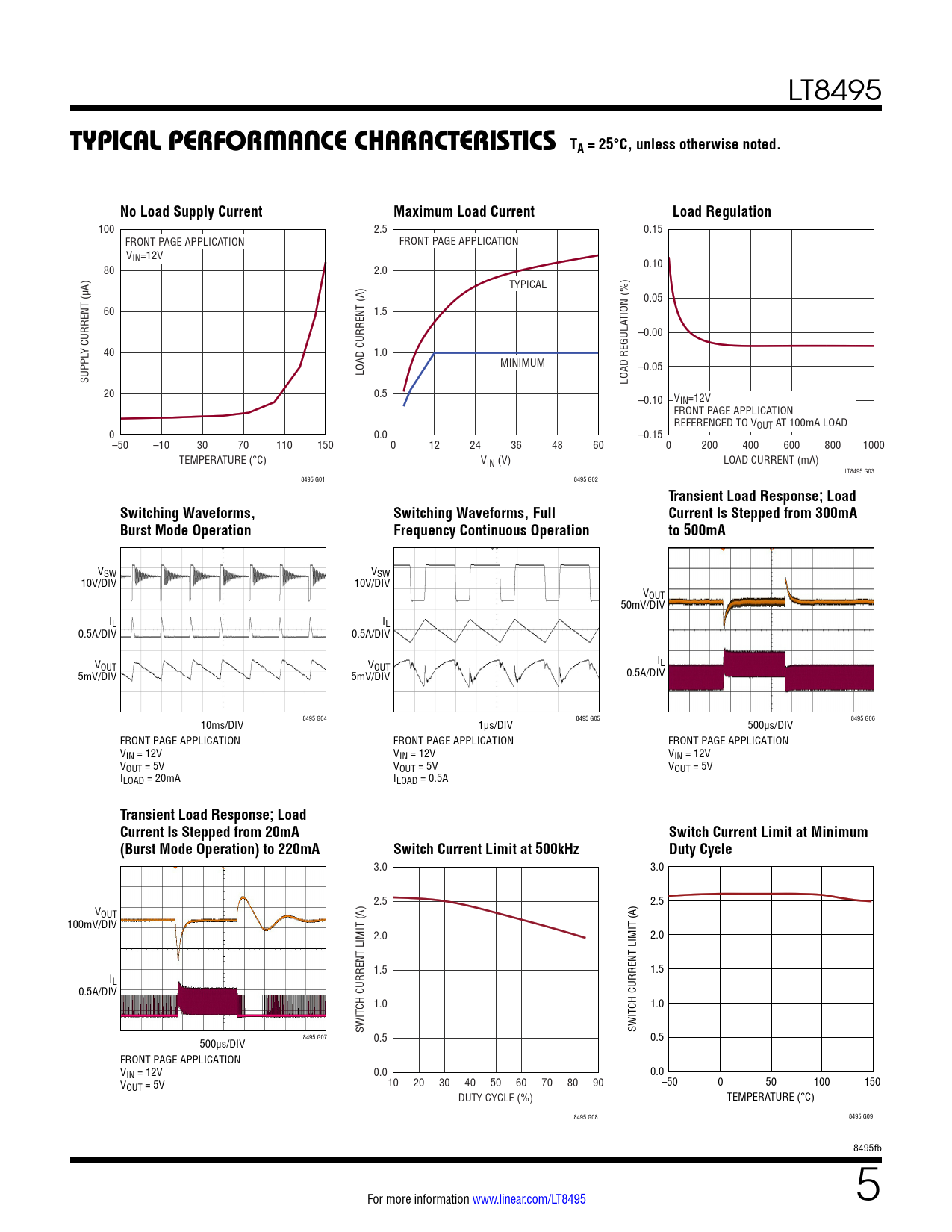 VSW VSW 10V/DIV 10V/DIV VOUT 50mV/DIV IL IL 0.5A/DIV 0.5A/DIV V I OUT V L OUT 5mV/DIV 0.5A/DIV 5mV/DIV 8495 G04 8495 G05 8495 G06 10ms/DIV 1µs/DIV 500µs/DIV FRONT PAGE APPLICATION FRONT PAGE APPLICATION FRONT PAGE APPLICATION VIN = 12V VIN = 12V VIN = 12V VOUT = 5V VOUT = 5V VOUT = 5V ILOAD = 20mA ILOAD = 0.5A