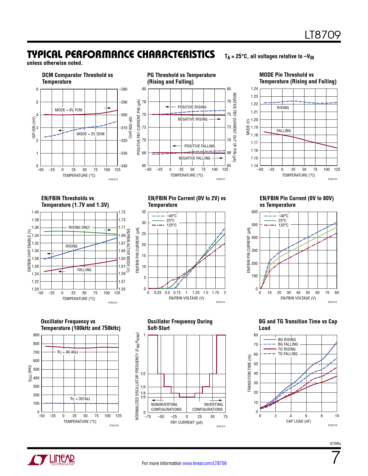 ) 900 1 80 NOM BG RISING 800 /F 70 BG FALLING SW TG RISING 700 RT = 46.4kΩ 60 TG FALLING 600 50 500 (kHz) 1/2 40 f OSC 400 TOR FREQUENCY (F 30 300 1/3 TRANSITION TIME (ns) 1/4 20 200 R 1/5 T = 357kΩ 100 10 NONINVERTING INVERTING CONFIGURATIONS CONFIGURATIONS 0 0 0 –50 –25 0 25 50 75 100 125 –75 –50 –25 0 25 50 75 0 2 4 6 8 10 NORMALIZED OSCILLA TEMPERATURE (°C) FBY CURRENT (µA) CAP LOAD (nF) 8709 G16 8709 G18 8709 G17 8709fa For more information www.linear.com/LT8709 7