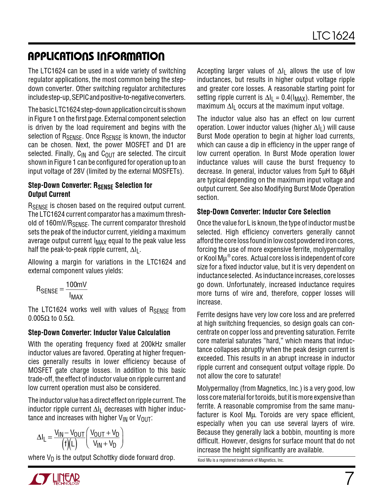 The LTC1624 can be used in a wide variety of switching Accepting larger values of ∆IL allows the use of low regulator applications, the most common being the step- inductances, but results in higher output voltage ripple down converter. Other switching regulator architectures and greater core losses. A reasonable starting point for include step-up, SEPIC and positive-to-negative converters. setting ripple current is ∆IL = 0.4(IMAX). Remember, the maximum ∆I The basic LTC1624 step-down application circuit is shown L occurs at the maximum input voltage. in Figure 1 on the first page. External component selection The inductor value also has an effect on low current is driven by the load requirement and begins with the operation. Lower inductor values (higher ∆IL) will cause selection of RSENSE. Once RSENSE is known, the inductor Burst Mode operation to begin at higher load currents, can be chosen. Next, the power MOSFET and D1 are which can cause a dip in efficiency in the upper range of selected. Finally, CIN and COUT are selected. The circuit low current operation. In Burst Mode operation lower shown in Figure 1 can be configured for operation up to an inductance values will cause the burst frequency to input voltage of 28V (limited by the external MOSFETs). decrease. In general, inductor values from 5µH to 68µH are typical depending on the maximum input voltage and