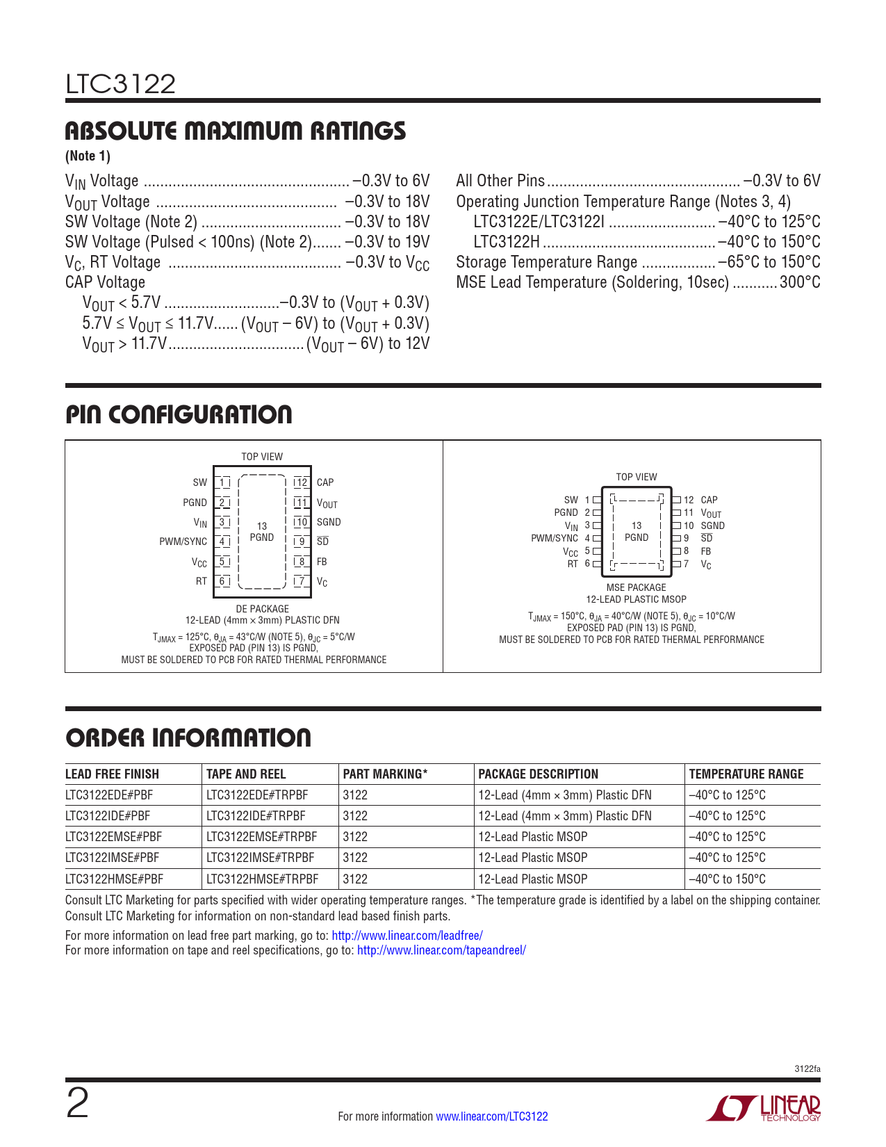 LTC3122 absoluTe MaxiMuM raTings(Note 1) VIN Voltage .. –0.3V to 6V All Other Pins ... –0.3V to 6V VOUT Voltage .. –0.3V to 18V Operating Junction Temperature Range (Notes 3, 4) SW Voltage (Note 2) .. –0.3V to 18V LTC3122E/LTC3122I .. –40°C to 125°C SW Voltage (Pulsed < 100ns) (Note 2) ... –0.3V to 19V LTC3122H .. –40°C to 150°C VC, RT Voltage .. –0.3V to VCC Storage Temperature Range .. –65°C to 150°C CAP Voltage MSE Lead Temperature (Soldering, 10sec) ...300°C VOUT < 5.7V ..–0.3V to (VOUT + 0.3V) 5.7V ≤ VOUT ≤ 11.7V..(VOUT – 6V) to (VOUT + 0.3V) VOUT > 11.7V ...(VOUT – 6V) to 12V pin conFiguraTion TOP VIEW SW 1 12 CAP TOP VIEW PGND 2 11 V SW 1 OUT 12 CAP PGND 2 11 VOUT VIN 3 10 13 SGND V 3 IN 13 10 SGND PGND PWM/SYNC 4 9 SD PWM/SYNC 4 PGND 9 SD V 5 CC 8 FB VCC 5 8 FB RT 6 7 VC RT 6 7 VC MSE PACKAGE 12-LEAD PLASTIC MSOP DE PACKAGE 12-LEAD (4mm × 3mm) PLASTIC DFN T JMAX = 150°C, θJA = 40°C/W (NOTE 5), θJC = 10°C/W EXPOSED PAD (PIN 13) IS PGND, TJMAX = 125°C, θJA = 43°C/W (NOTE 5), θJC = 5°C/W MUST BE SOLDERED TO PCB FOR RATED THERMAL PERFORMANCE EXPOSED PAD (PIN 13) IS PGND, MUST BE SOLDERED TO PCB FOR RATED THERMAL PERFORMANCE orDer inForMaTion LEAD FREE FINISHTAPE AND REELPART MARKING*PACKAGE DESCRIPTIONTEMPERATURE RANGE LTC3122EDE#PBF LTC3122EDE#TRPBF 3122 12-Lead (4mm × 3mm) Plastic DFN –40°C to 125°C LTC3122IDE#PBF LTC3122IDE#TRPBF 3122 12-Lead (4mm × 3mm) Plastic DFN –40°C to 125°C LTC3122EMSE#PBF LTC3122EMSE#TRPBF 3122 12-Lead Plastic MSOP –40°C to 125°C LTC3122IMSE#PBF LTC3122IMSE#TRPBF 3122 12-Lead Plastic MSOP –40°C to 125°C LTC3122HMSE#PBF LTC3122HMSE#TRPBF 3122 12-Lead Plastic MSOP –40°C to 150°C Consult LTC Marketing for parts specified with wider operating temperature ranges. *The temperature grade is identified by a label on the shipping container. Consult LTC Marketing for information on non-standard lead based finish parts. For more information on lead free part marking, go to: http://www.linear.com/leadfree/ For more information on tape and reel specifications, go to: http://www.linear.com/tapeandreel/ 3122fa 2 For more information www.linear.com/LTC3122 Document Outline Features Applications Description Typical Application Absolute Maximum Ratings Pin Configuration Order Information Electrical Characteristics Typical Performance Characteristics Pin Functions Block Diagram Operation Applications Information Typical Applications Package Description Typical Application Related Parts