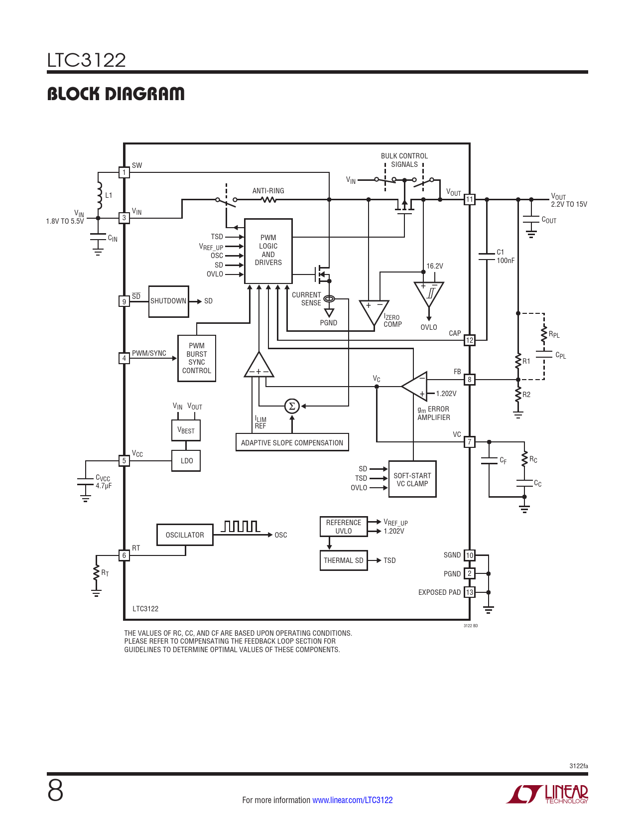 LTC3122 block DiagraM BULK CONTROL SW SIGNALS 1 VIN ANTI-RING L1 VOUT 11 VOUT 2.2V TO 15V V V IN IN 3 1.8V TO 5.5V COUT C TSD IN PWM VREF_UP LOGIC OSC AND C1 DRIVERS 100nF SD 16.2V OVLO + – SD CURRENT 9 SHUTDOWN SD SENSE + – IZERO PGND COMP OVLO CAP R 12 PL PWM PWM/SYNC BURST 4 CPL SYNC R1 CONTROL – + – FB VC – 8 + 1.202V R2 VIN VOUT gm ERROR ILIM AMPLIFIER REF VBEST VC ADAPTIVE SLOPE COMPENSATION 7 VCC 5 LDO C R F C SD C SOFT-START VCC TSD 4.7µF VC CLAMP C OVLO C REFERENCE VREF_UP OSCILLATOR OSC UVLO 1.202V RT 6 SGND 10 THERMAL SD TSD RT PGND 2 EXPOSED PAD 13 LTC3122 3122 BD THE VALUES OF RC, CC, AND CF ARE BASED UPON OPERATING CONDITIONS. PLEASE REFER TO COMPENSATING THE FEEDBACK LOOP SECTION FOR GUIDELINES TO DETERMINE OPTIMAL VALUES OF THESE COMPONENTS. 3122fa 8 For more information www.linear.com/LTC3122 Document Outline Features Applications Description Typical Application Absolute Maximum Ratings Pin Configuration Order Information Electrical Characteristics Typical Performance Characteristics Pin Functions Block Diagram Operation Applications Information Typical Applications Package Description Typical Application Related Parts