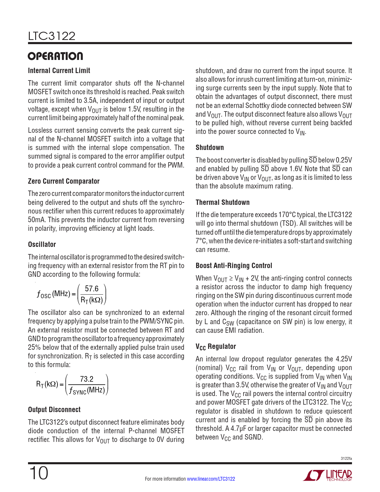 LTC3122 operaTionInternal Current Limit shutdown, and draw no current from the input source. It The current limit comparator shuts off the N-channel also allows for inrush current limiting at turn-on, minimiz- MOSFET switch once its threshold is reached. Peak switch ing surge currents seen by the input supply. Note that to current is limited to 3.5A, independent of input or output obtain the advantages of output disconnect, there must voltage, except when V not be an external Schottky diode connected between SW OUT is below 1.5V, resulting in the current limit being approximately half of the nominal peak. and VOUT. The output disconnect feature also allows VOUT to be pulled high, without reverse current being backfed Lossless current sensing converts the peak current sig- into the power source connected to VIN. nal of the N-channel MOSFET switch into a voltage that is summed with the internal slope compensation. The Shutdown summed signal is compared to the error amplifier output The boost converter is disabled by pulling SD below 0.25V to provide a peak current control command for the PWM. and enabled by pulling SD above 1.6V. Note that SD can Zero Current Comparator be driven above VIN or VOUT, as long as it is limited to less than the absolute maximum rating. The zero current comparator monitors the inductor current being delivered to the output and shuts off the synchro- Thermal Shutdown nous rectifier when this current reduces to approximately If the die temperature exceeds 170°C typical, the LTC3122 50mA. This prevents the inductor current from reversing will go into thermal shutdown (TSD). All switches will be in polarity, improving efficiency at light loads. turned off until the die temperature drops by approximately Oscillator 7°C, when the device re-initiates a soft-start and switching can resume. The internal oscil ator is programmed to the desired switch- ing frequency with an external resistor from the RT pin to Boost Anti-Ringing Control GND according to the following formula: When VOUT ≥ VIN + 2V, the anti-ringing control connects ⎛ ⎞ a resistor across the inductor to damp high frequency ƒ 57.6 ⎜ ⎟ OSC (MHz) = ringing on the SW pin during discontinuous current mode ⎝RT(kΩ)⎠ operation when the inductor current has dropped to near The oscillator also can be synchronized to an external zero. Although the ringing of the resonant circuit formed frequency by applying a pulse train to the PWM/SYNC pin. by L and CSW (capacitance on SW pin) is low energy, it An external resistor must be connected between RT and can cause EMI radiation. GND to program the oscillator to a frequency approximately 25% below that of the externally applied pulse train used VCC Regulator for synchronization. RT is selected in this case according An internal low dropout regulator generates the 4.25V to this formula: (nominal) VCC rail from VIN or VOUT, depending upon ⎛ ⎞ operating conditions. VCC is supplied from VIN when VIN R 73.2 T(kΩ) = ⎜ ⎟ is greater than 3.5V, otherwise the greater of VIN and VOUT ⎝ ƒSYNC(MHz)⎠ is used. The VCC rail powers the internal control circuitry and power MOSFET gate drivers of the LTC3122. The VCC Output Disconnect regulator is disabled in shutdown to reduce quiescent The LTC3122’s output disconnect feature eliminates body current and is enabled by forcing the SD pin above its diode conduction of the internal P-channel MOSFET threshold. A 4.7µF or larger capacitor must be connected rectifier. This allows for V between V OUT to discharge to 0V during CC and SGND. 3122fa 10 For more information www.linear.com/LTC3122 Document Outline Features Applications Description Typical Application Absolute Maximum Ratings Pin Configuration Order Information Electrical Characteristics Typical Performance Characteristics Pin Functions Block Diagram Operation Applications Information Typical Applications Package Description Typical Application Related Parts