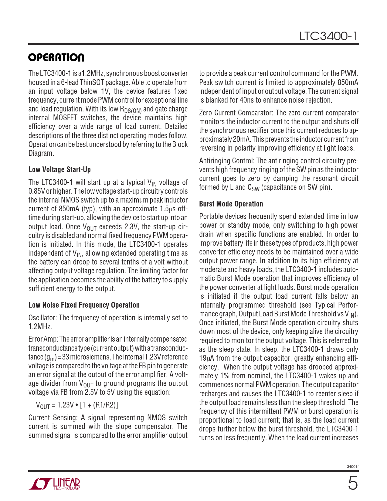 LTC3400-1 UOPERATIO The LTC3400-1 is a1.2MHz, synchronous boost converter to provide a peak current control command for the PWM. housed in a 6-lead ThinSOT package. Able to operate from Peak switch current is limited to approximately 850mA an input voltage below 1V, the device features fixed independent of input or output voltage. The current signal frequency, current mode PWM control for exceptional line is blanked for 40ns to enhance noise rejection. and load regulation. With its low RDS(ON) and gate charge Zero Current Comparator: The zero current comparator internal MOSFET switches, the device maintains high monitors the inductor current to the output and shuts off efficiency over a wide range of load current. Detailed the synchronous rectifier once this current reduces to ap- descriptions of the three distinct operating modes follow. proximately 20mA. This prevents the inductor current from Operation can be best understood by referring to the Block reversing in polarity improving efficiency at light loads. Diagram. Antiringing Control: The antiringing control circuitry pre- Low Voltage Start-Up vents high frequency ringing of the SW pin as the inductor current goes to zero by damping the resonant circuit The LTC3400-1 will start up at a typical VIN voltage of formed by L and C 0.85V or higher. The low voltage start-up circuitry controls SW (capacitance on SW pin). the internal NMOS switch up to a maximum peak inductor Burst Mode Operation current of 850mA (typ), with an approximate 1.5µs off- time during start-up, allowing the device to start up into an Portable devices frequently spend extended time in low output load. Once V power or standby mode, only switching to high power OUT exceeds 2.3V, the start-up cir- cuitry is disabled and normal fixed frequency PWM opera- drain when specific functions are enabled. In order to tion is initiated. In this mode, the LTC3400-1 operates improve battery life in these types of products, high power independent of V converter efficiency needs to be maintained over a wide IN, allowing extended operating time as the battery can droop to several tenths of a volt without output power range. In addition to its high efficiency at affecting output voltage regulation. The limiting factor for moderate and heavy loads, the LTC3400-1 includes auto- the application becomes the ability of the battery to supply matic Burst Mode operation that improves efficiency of sufficient energy to the output. the power converter at light loads. Burst mode operation is initiated if the output load current falls below an Low Noise Fixed Frequency Operation internally programmed threshold (see Typical Perfor- mance graph, Output Load Burst Mode Threshold vs V Oscillator: The frequency of operation is internally set to IN). Once initiated, the Burst Mode operation circuitry shuts 1.2MHz. down most of the device, only keeping alive the circuitry Error Amp: The error amplifier is an internally compensated required to monitor the output voltage. This is referred to transconductance type (current output) with a transconduc- as the sleep state. In sleep, the LTC3400-1 draws only tance (gm) = 33 microsiemens. The internal 1.23V reference 19µA from the output capacitor, greatly enhancing effi- voltage is compared to the voltage at the FB pin to generate ciency. When the output voltage has drooped approxi- an error signal at the output of the error amplifier. A volt- mately 1% from nominal, the LTC3400-1 wakes up and age divider from VOUT to ground programs the output commences normal PWM operation. The output capacitor voltage via FB from 2.5V to 5V using the equation: recharges and causes the LTC3400-1 to reenter sleep if V the output load remains less than the sleep threshold. The OUT = 1.23V • [1 + (R1/R2)] frequency of this intermittent PWM or burst operation is Current Sensing: A signal representing NMOS switch proportional to load current; that is, as the load current current is summed with the slope compensator. The drops further below the burst threshold, the LTC3400-1 summed signal is compared to the error amplifier output turns on less frequently. When the load current increases 34001f 5
