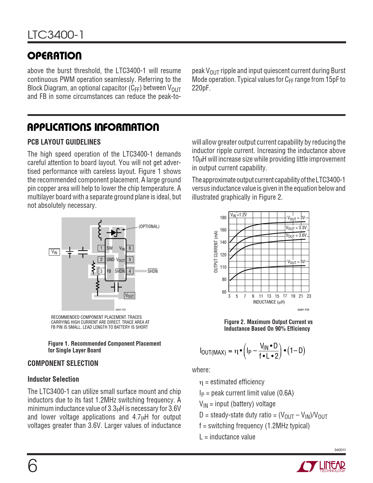 will allow greater output current capability by reducing the inductor ripple current. Increasing the inductance above The high speed operation of the LTC3400-1 demands 10 careful attention to board layout. You will not get adver- µH will increase size while providing little improvement in output current capability. tised performance with careless layout. Figure 1 shows the recommended component placement. A large ground The approximate output current capability of the LTC3400-1 pin copper area will help to lower the chip temperature. A versus inductance value is given in the equation below and multilayer board with a separate ground plane is ideal, but illustrated graphically in Figure 2. not absolutely necessary. V 180 IN =1.2V VOUT = 3V (OPTIONAL) V 160 OUT = 3.3V VOUT = 3.6V 140 1 SW V 6 IN VIN 120 2 GND V 5 OUT VOUT = 5V 110 3 FB SHDN 4 SHDN OUTPUT CURRENT (mA) 80 60 VOUT 3 5 7 9 11 13 15 17 19 21 23 INDUCTANCE (µH) 34001 F02 34001 F03 RECOMMENDED COMPONENT PLACEMENT. TRACES CARRYING HIGH CURRENT ARE DIRECT. TRACE AREA AT