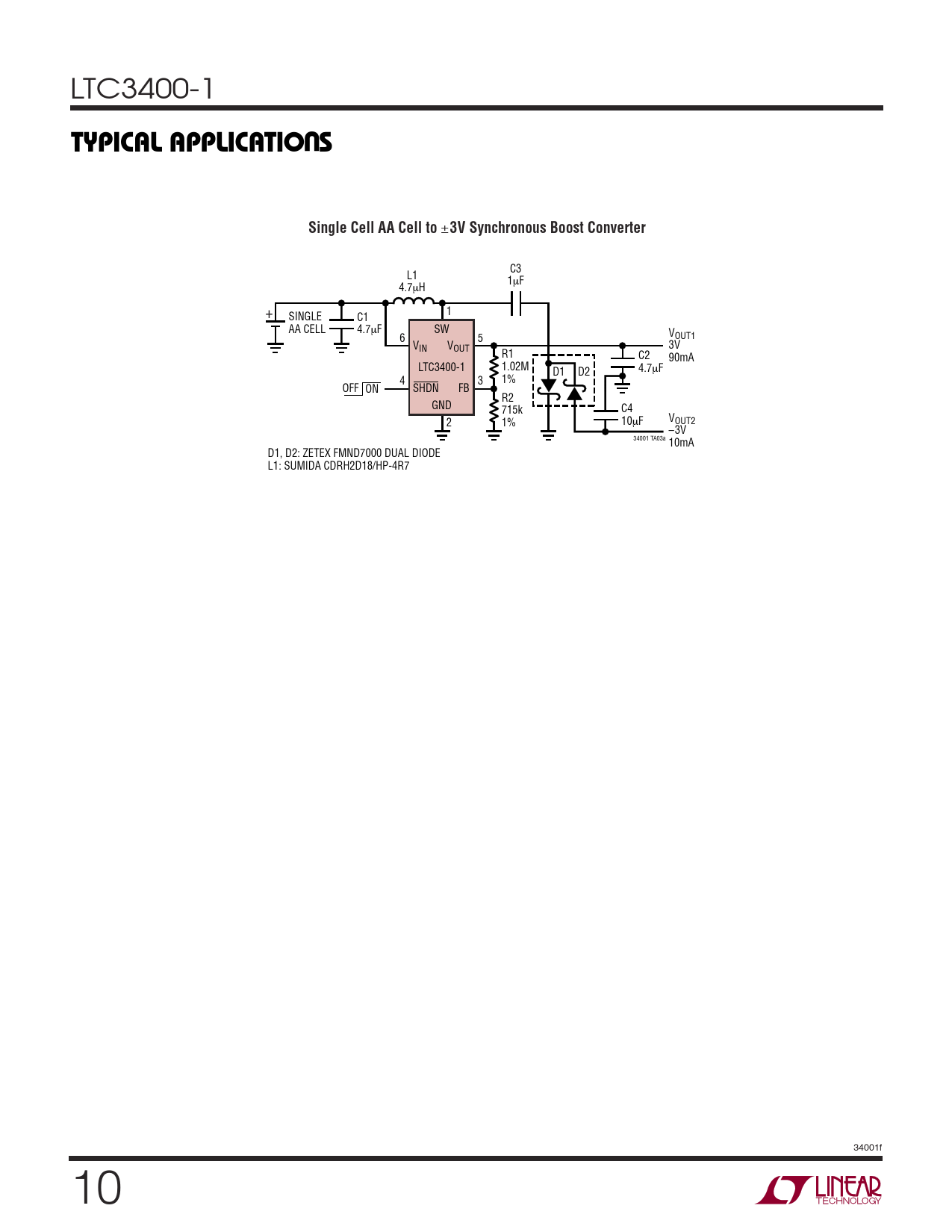 C3 L1 1µF 4.7µH 1 + SINGLE C1 AA CELL 4.7µF SW VOUT1 6 5 V V IN OUT 3V R1 C2 90mA LTC3400-1 1.02M D1 D2 4.7µF 4 3 1% OFF ON SHDN FB R2 GND 715k C4 2 1% V 10µF OUT2 –3V 34001 TA03a 10mA D1, D2: ZETEX FMND7000 DUAL DIODE L1: SUMIDA CDRH2D18/HP-4R7 34001f 10