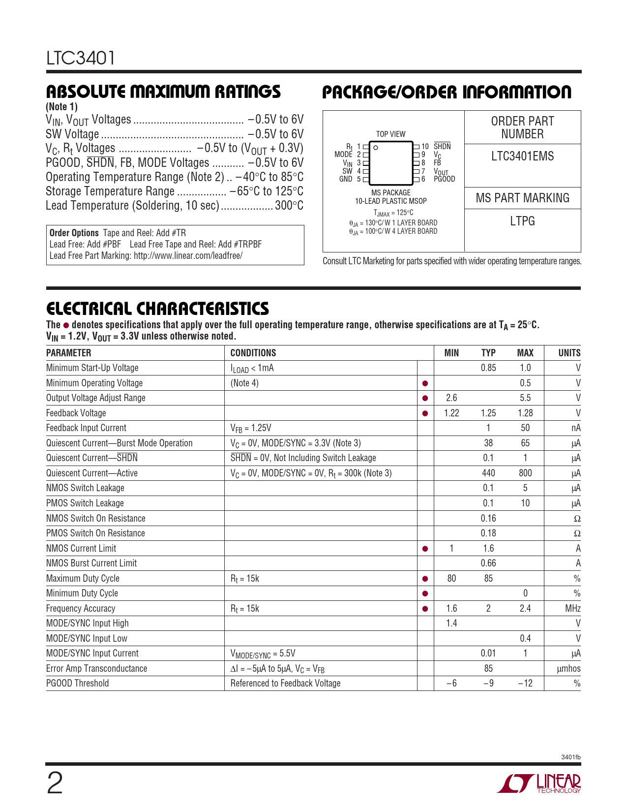 LTC3401 WWWUUWUABSOLUTE AXI U RATI GSPACKAGE/ORDER I FOR ATIO(Note 1) VIN, VOUT Voltages .. – 0.5V to 6V ORDER PART SW Voltage ... – 0.5V to 6V TOP VIEW NUMBER V R 1 10 SHDN C, Rt Voltages ... – 0.5V to (VOUT + 0.3V) t MODE 2 9 VC LTC3401EMS PGOOD, SHDN, FB, MODE Voltages ... – 0.5V to 6V V 3 IN 8 FB SW 4 7 V Operating Temperature Range (Note 2) .. – 40°C to 85°C OUT GND 5 6 PGOOD Storage Temperature Range ... – 65°C to 125°C MS PACKAGE 10-LEAD PLASTIC MSOP MS PART MARKING Lead Temperature (Soldering, 10 sec).. 300°C TJMAX = 125°C θ LTPG JA = 130°C/ W 1 LAYER BOARD Order Options Tape and Reel: Add #TR θJA = 100°C/ W 4 LAYER BOARD Lead Free: Add #PBF Lead Free Tape and Reel: Add #TRPBF Lead Free Part Marking: http://www.linear.com/leadfree/ Consult LTC Marketing for parts specified with wider operating temperature ranges. ELECTRICAL CHARACTERISTICS The ● denotes specifications that apply over the full operating temperature range, otherwise specifications are at TA = 25 ° C.VIN = 1.2V, VOUT = 3.3V unless otherwise noted.PARAMETERCONDITIONSMINTYPMAXUNITS Minimum Start-Up Voltage ILOAD < 1mA 0.85 1.0 V Minimum Operating Voltage (Note 4) ● 0.5 V Output Voltage Adjust Range ● 2.6 5.5 V Feedback Voltage ● 1.22 1.25 1.28 V Feedback Input Current VFB = 1.25V 1 50 nA Quiescent Current—Burst Mode Operation VC = 0V, MODE/SYNC = 3.3V (Note 3) 38 65 μA Quiescent Current—SHDN SHDN = 0V, Not Including Switch Leakage 0.1 1 μA Quiescent Current—Active VC = 0V, MODE/SYNC = 0V, Rt = 300k (Note 3) 440 800 μA NMOS Switch Leakage 0.1 5 μA PMOS Switch Leakage 0.1 10 μA NMOS Switch On Resistance 0.16 Ω PMOS Switch On Resistance 0.18 Ω NMOS Current Limit ● 1 1.6 A NMOS Burst Current Limit 0.66 A Maximum Duty Cycle Rt = 15k ● 80 85 % Minimum Duty Cycle ● 0 % Frequency Accuracy Rt = 15k ● 1.6 2 2.4 MHz MODE/SYNC Input High 1.4 V MODE/SYNC Input Low 0.4 V MODE/SYNC Input Current VMODE/SYNC = 5.5V 0.01 1 μA Error Amp Transconductance ΔI = –5μA to 5μA, VC = VFB 85 μmhos PGOOD Threshold Referenced to Feedback Voltage – 6 – 9 – 12 % 3401fb 2