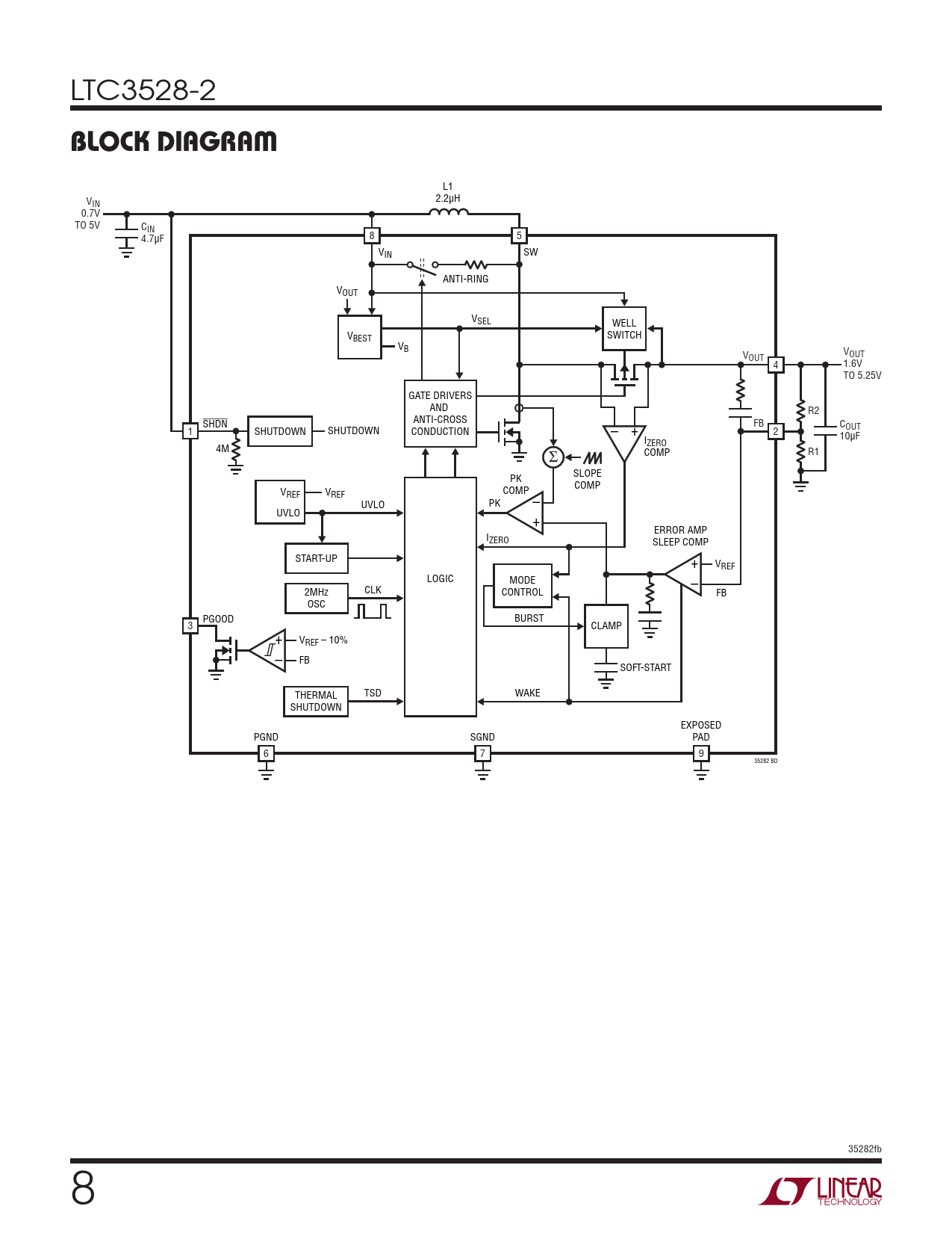L1 2.2µH VIN 0.7V TO 5V CIN 8 5 4.7µF VIN SW ANTI-RING VOUT VSEL WELL V SWITCH BEST VB V V OUT OUT 4 1.6V TO 5.25V GATE DRIVERS AND R2 ANTI-CROSS SHDN FB C 1 SHUTDOWN SHUTDOWN CONDUCTION – + 2 OUT I 10µF ZERO 4M Σ COMP R1 PK SLOPE V COMP REF VREF – COMP UVLO PK UVLO + ERROR AMP IZERO SLEEP COMP START-UP + VREF LOGIC MODE – 2MHz CLK CONTROL FB OSC PGOOD BURST 3 CLAMP + VREF – 10% – FB SOFT-START THERMAL TSD WAKE SHUTDOWN EXPOSED PGND SGND PAD 6 7 9 35282 BD 35282fb 8 Document Outline Features Applications Description Typical Application Absolute Maximum Ratings Pin Configuration Order Information Electrical Characteristics Typical Performance Characteristics Pin Functions Block Diagram Operation Applications Information Typical Applications Package Description Revision History Related Parts